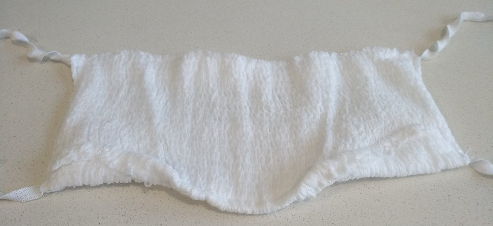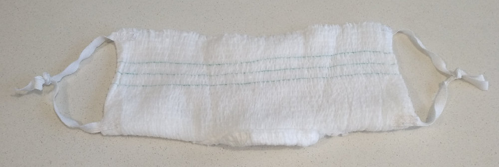 Es una mascarilla que no me quedó muy bonita porque la hice aprovechando materiales que tenía inservibles. Aparte, la tela de la cintura de un pañal no es muy manejable que digamos. Pero si coséis con hilo blanco, podréis ir modificando cualquier cosa que os parezca fea o quede mal.