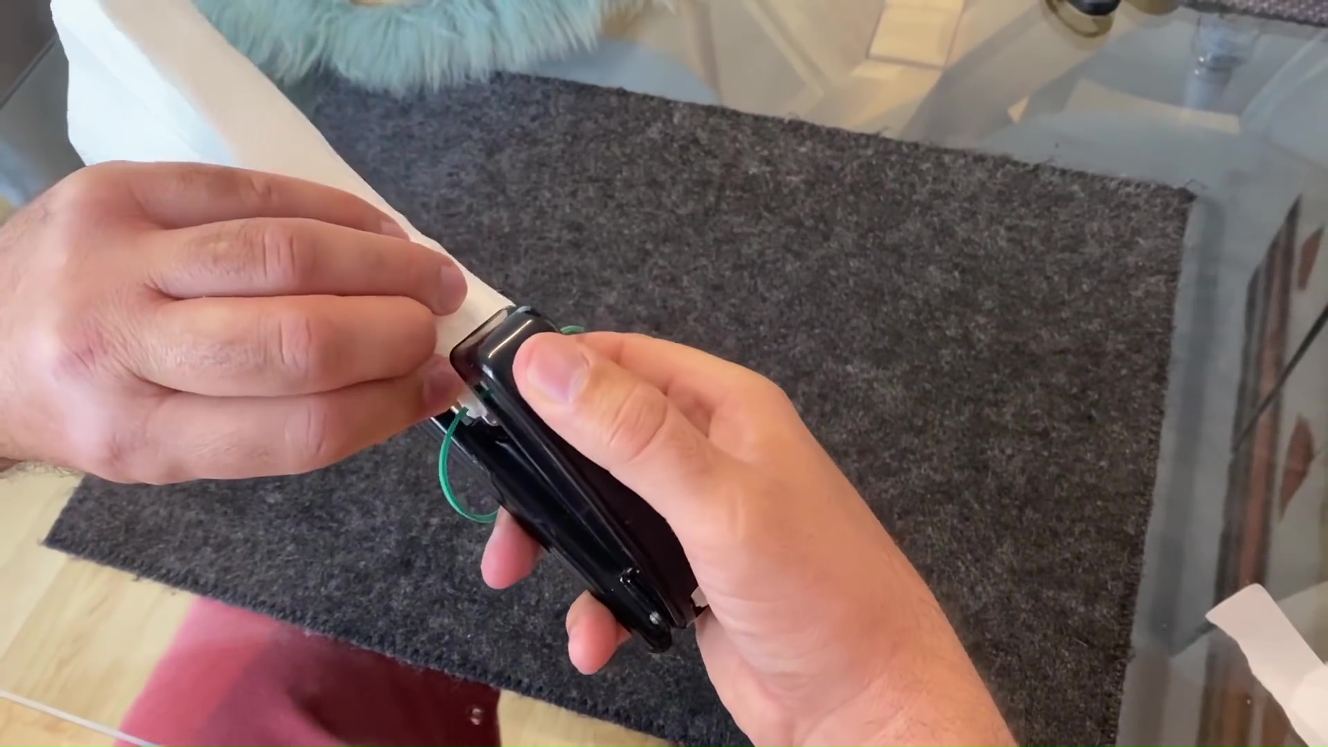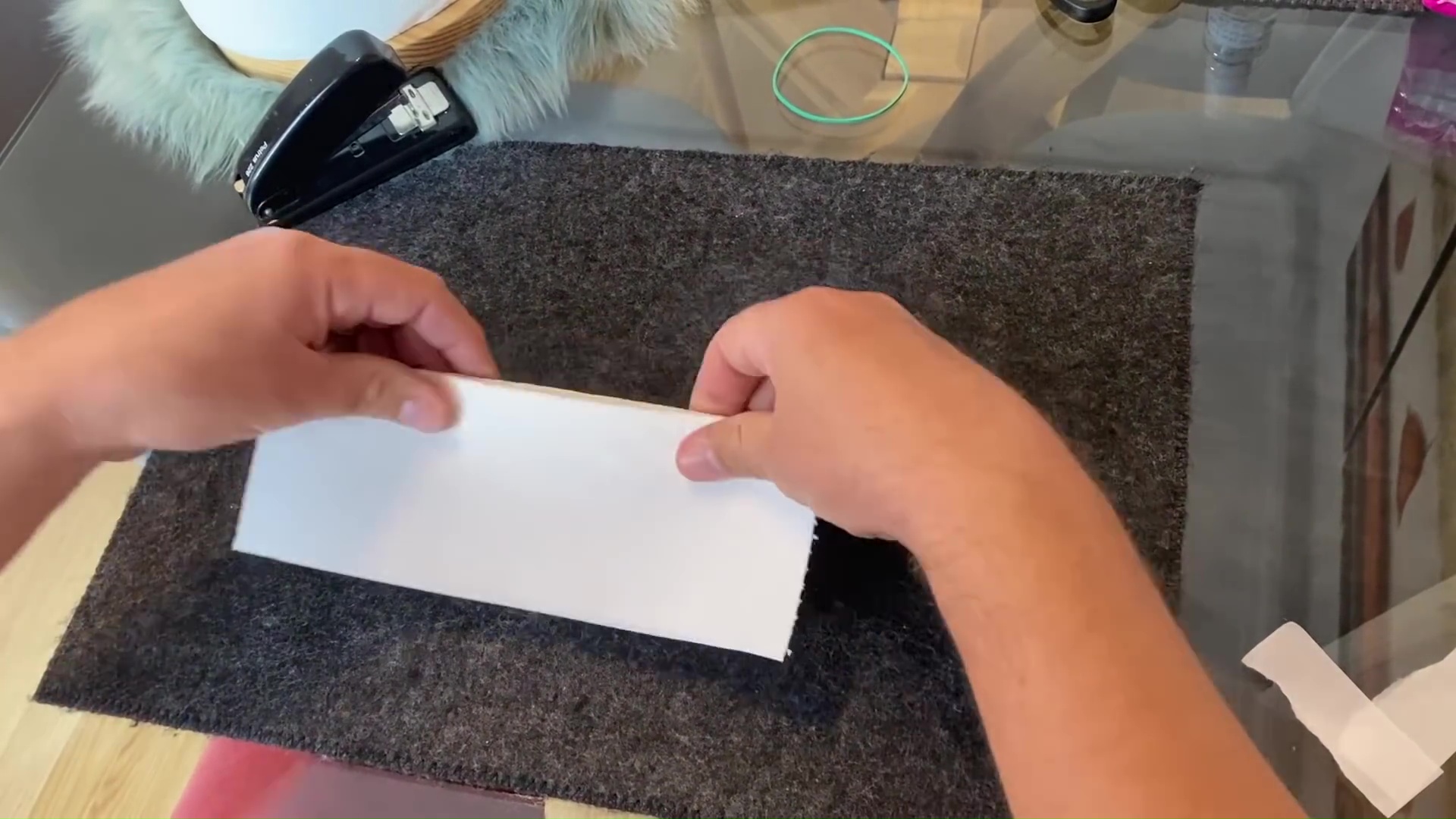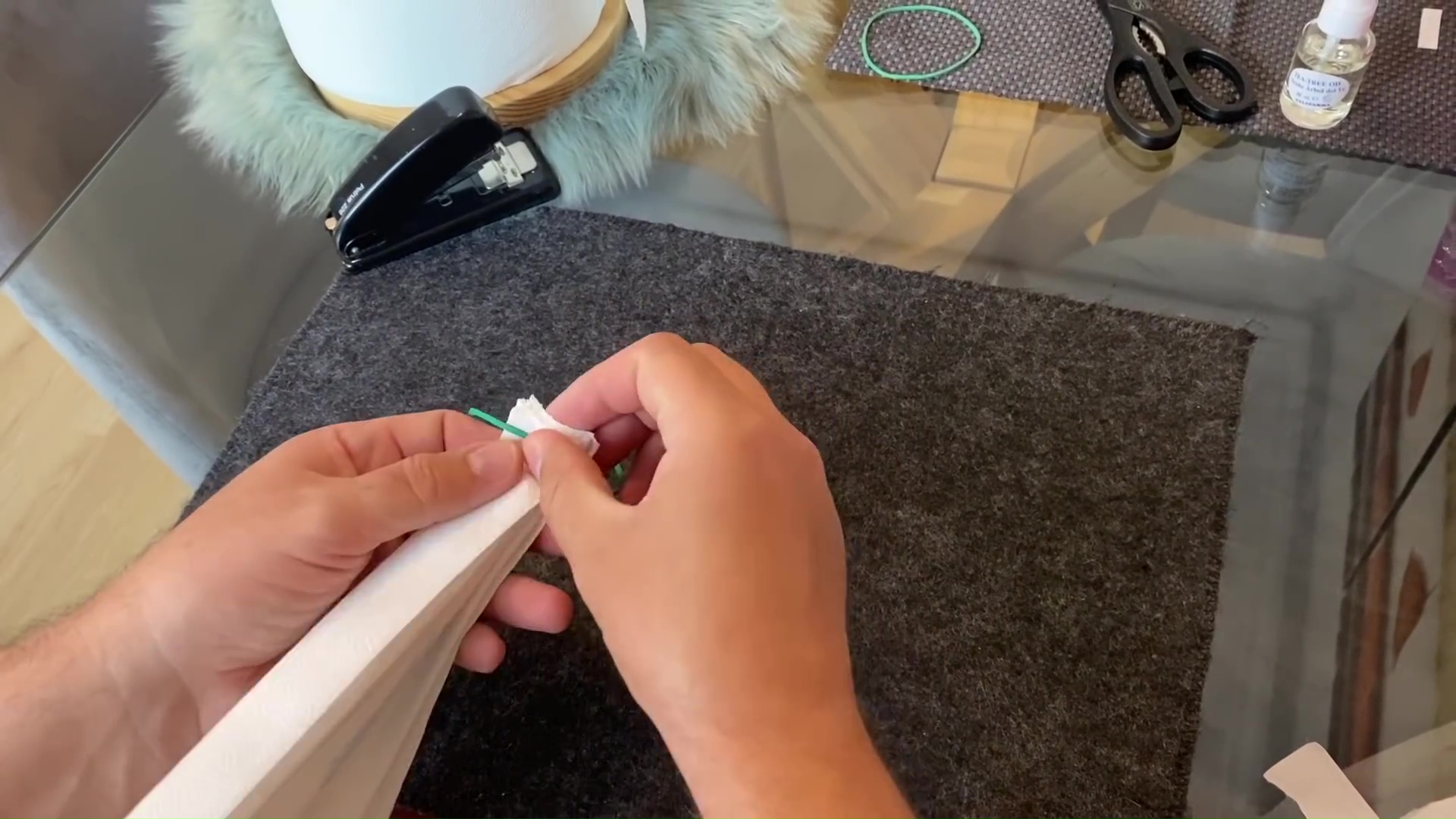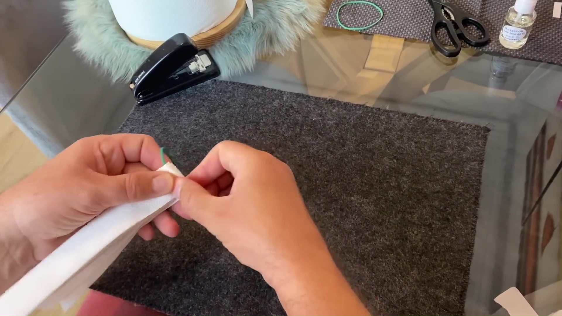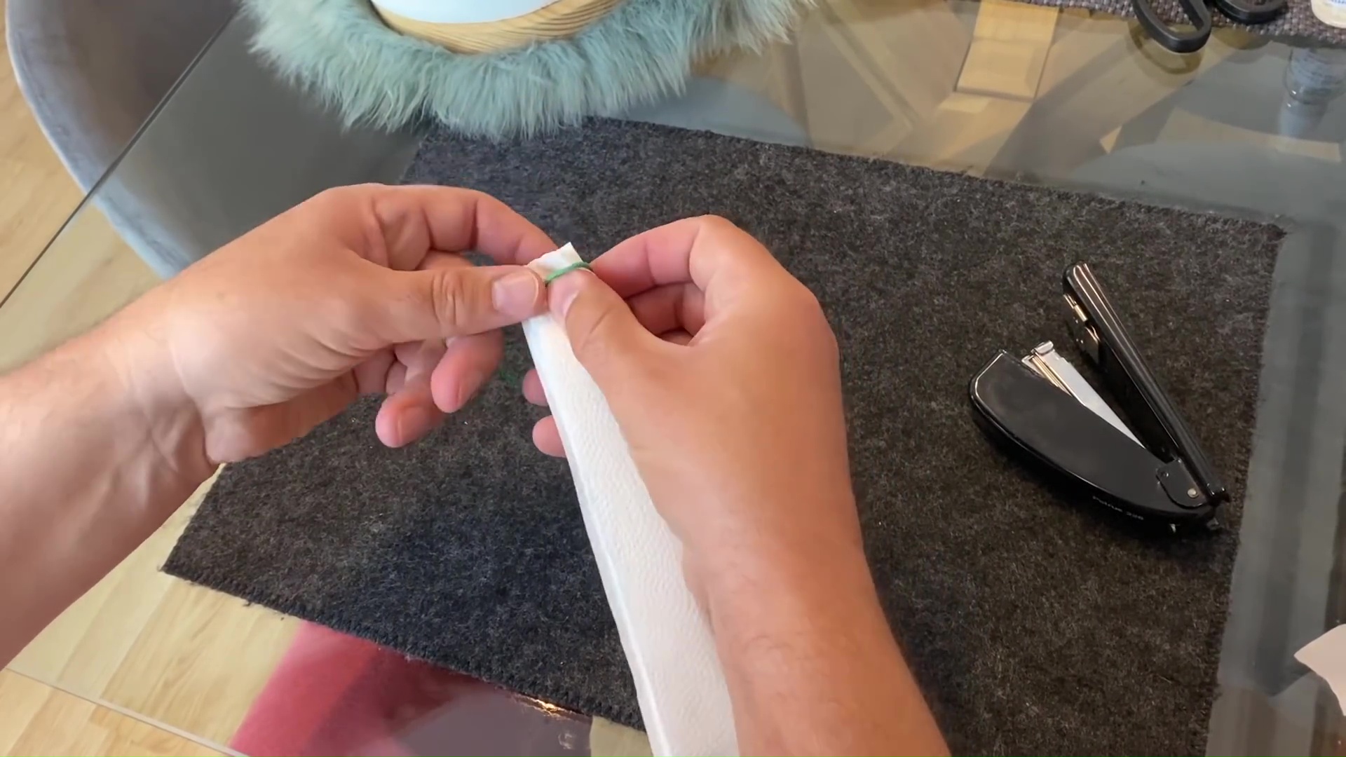 Realizamos otra doblez con el papel y grapamos para que el elástico no se escape.