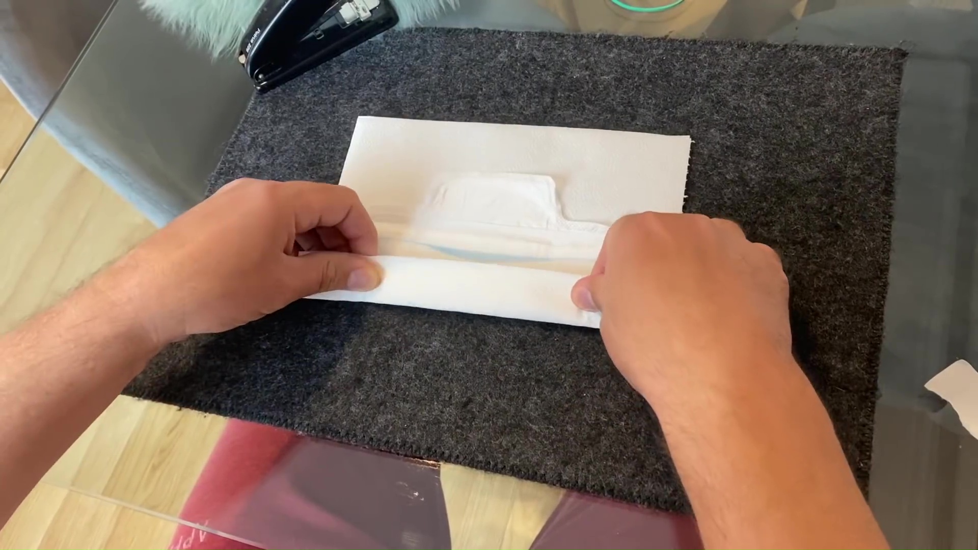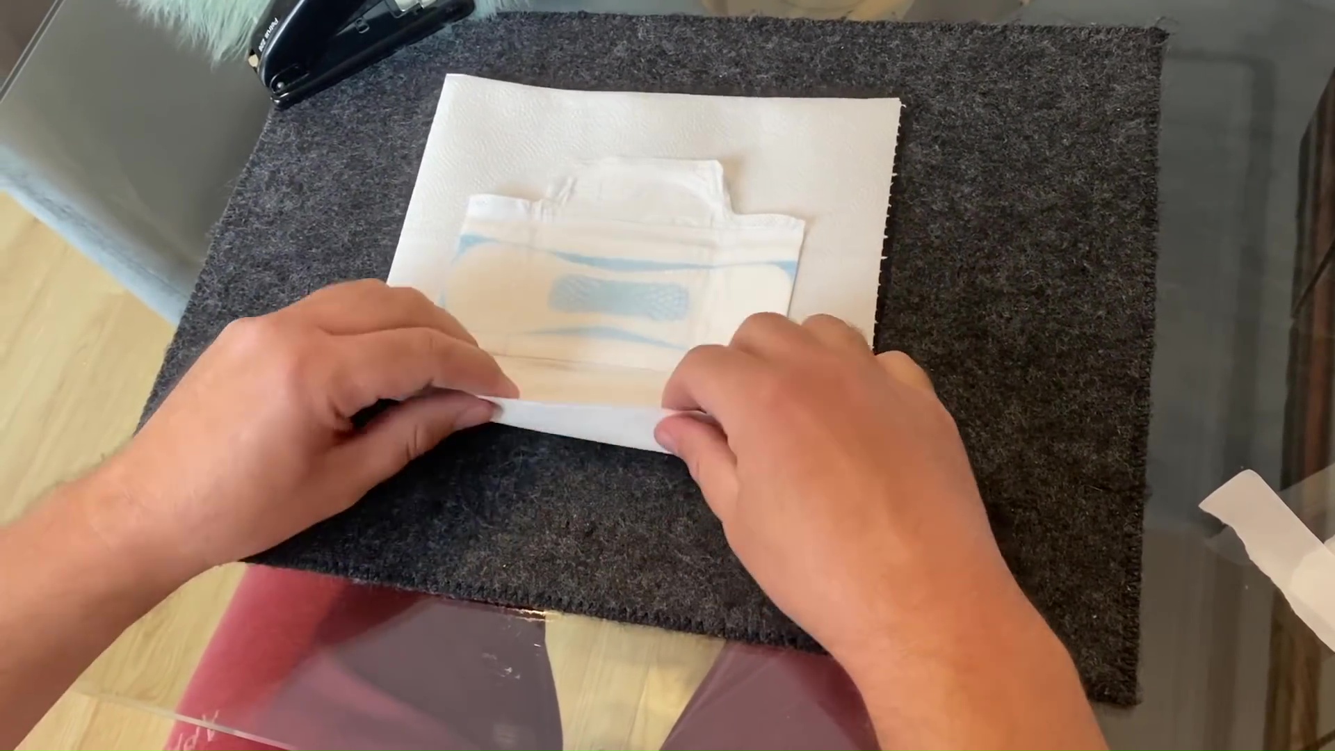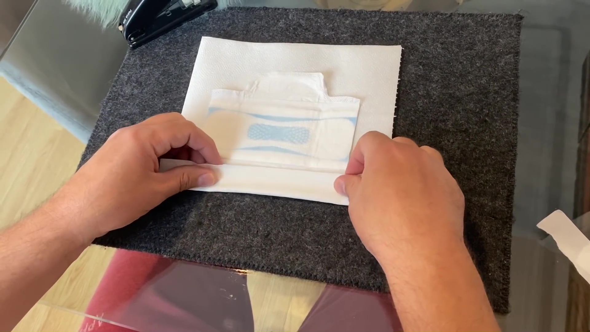 Colocamos la compresa encima de las hojas de papel de cocina y la centramos.