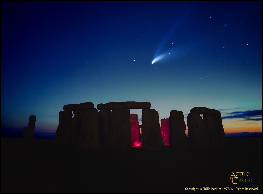 El cometa Hale-Bopp sobre Stonehenge, el cometa del siglo. La foto fue realizada el 30 de marzo de 1997 a las 21:15 horas, dos días antes de su perihelio (el punto en que se encuentra más cerca del Sol en su recorrido). Hale-Bopp se encontraba en la constelación de Andrómeda, cerca del borde con Perseo. Se puede observar la estrella Alamak a la izquierda de la cola del cometa, y parte de la constelación de Casiopea en la derecha superior de la imagen.