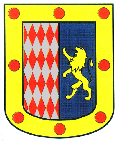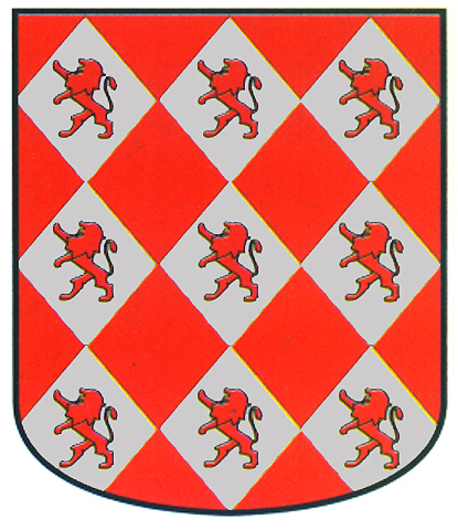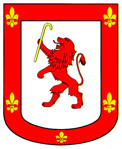 Armas: Escudo partido: a la mano derecha losanges de plata y gules y en la otra mitad, en azur un león de oro rampante y una orla de oro y en ella ocho roeles de gules.