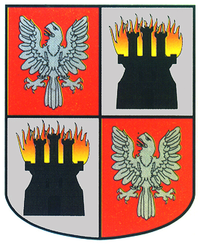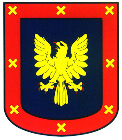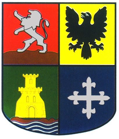 Armas: Escudo cuartelado: 1º y el 4º: de gules y un águila de plata. 2º y 3º: de plata y un castillo con llamas que salen de su parte superior.