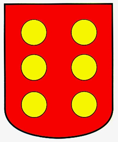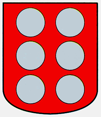 Armas: En campo de gules, seis bezantes de oro puestos en dos palos.