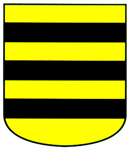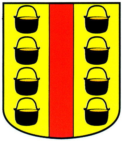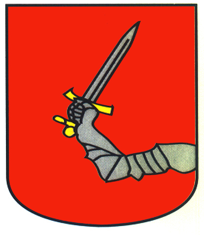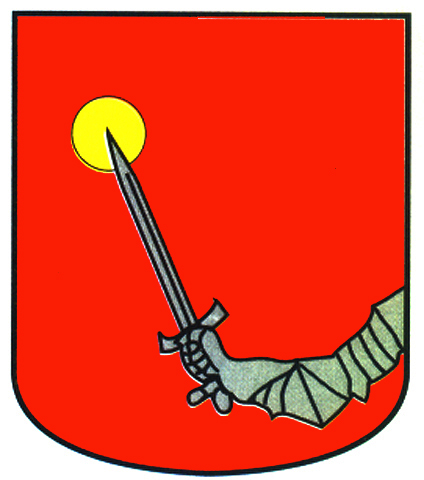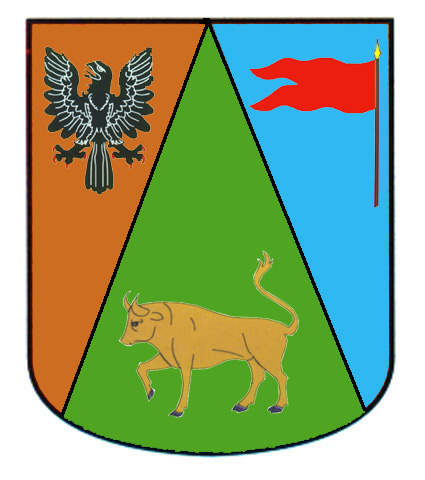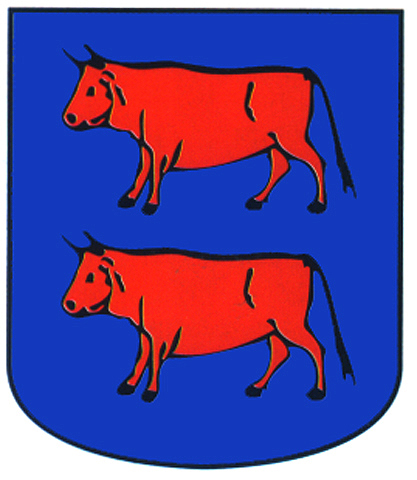 Armas: Escudo mantelado: 1.º en campo de oro, un águila de sable; 2.º en campo de azur, una bandera de gules con el asta de oro, y el mantel de sinople, con una vaca de oro.