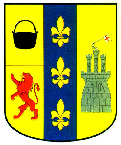 Armas: Escudo partido por un palo de azur, cargado de tres flores de lis de oro, con una caldera de sable, medio cortada con un león rampante de gules sobre oro, y la segunda, también de oro, con un castillo de piedra de cuya torre homenaje sale un brazo armado empuñando una bandera blanca cargada con una cruz de gules.