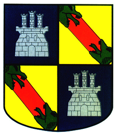 Armas: Escudo cuartelado: 1º y 4º; de azur, con un castillo de plata y 2º y 3º; de oro, con una banda de gules engolada en dragantes de sinople.