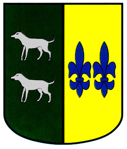Armas: Escudo partido: 1º ; en sinople, dos lebreles de plata y 2º ; en oro, dos lises de azur puestos en faja.