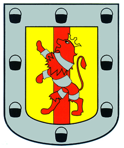 Armas: Escudo de oro y un palo o bastón de gules, sobrepuesto un león de este color coronado de oro y envuelto en una cinta o banda de plata. Bordura de plata y ocho calderas de sable.