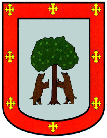 Armas: En campo de plata, un peral de sinople con fruto al natural y dos osos, de su color, al tronco. Bordura de gules con ocho cruces treboladas de oro.
