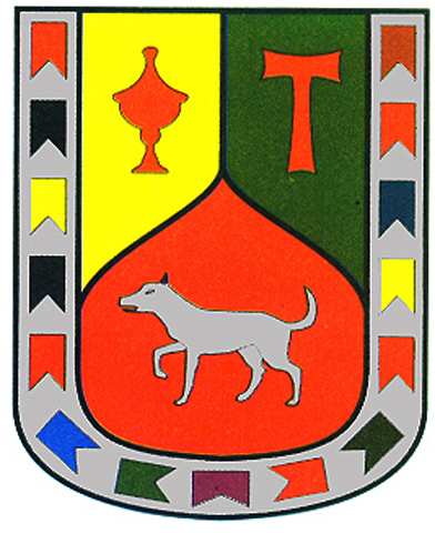 Armas: Escudo de oro, partido en mantel; en el 1º un roque de gules. En el 2º esta señal T del mismo color; en la punta un lebrel de plata. Bordura del mismo metal y quince banderas.