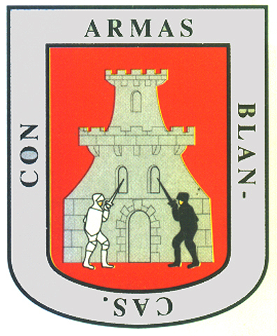 Armas: Campo de gules y castillo de plata, en cuya puerta, uno a cada lado, hay dos caballeros, uno con armadura negra y otro con armadura blanca. La bordura es de plata con este lema: «Con Armas Blancas».
