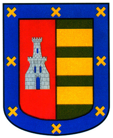 Armas: En campo de gules, un castillo de plata aclarado de azur; partido de sinople con tres fajas de oro. Bordura de azur con ocho aspas de oro.