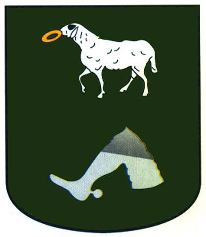 Armas: Un cordero con un bollo en la boca y un muslo armado con una pierna y un pie calzado con una espuela, todo ello sobre campo de sinople.