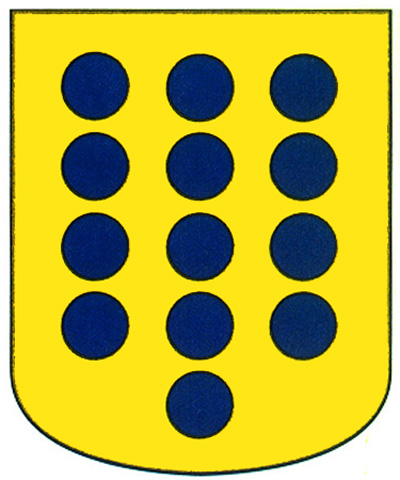 Armas: En campo de oro, trece roeles de azur.