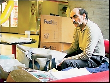 Nasseri siendo fotografiado junto a un poster publicitario de la película, que estaba en una de las maletas al lado de su sofá.