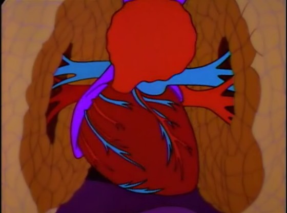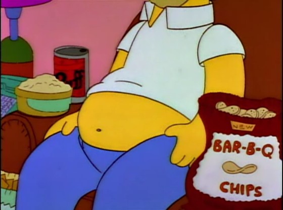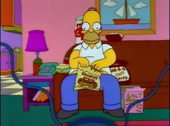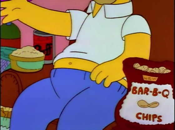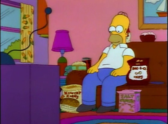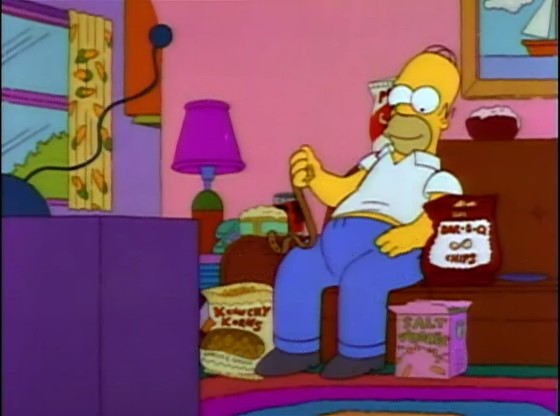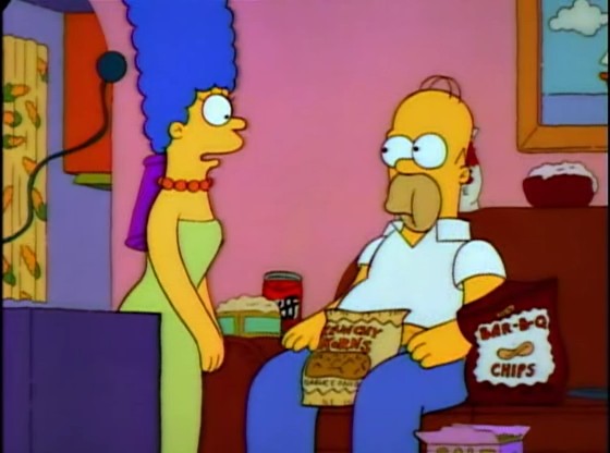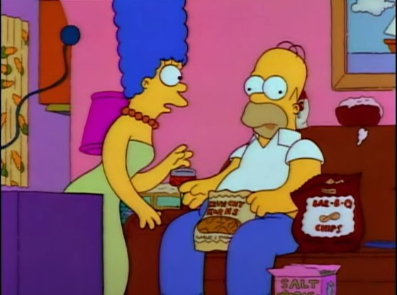 Es increíble la habilidad que tiene Homer para comer muchos aperitivos a la vez, jeje. Marge le advierte que esa comida no es buena para la salud, cosa que demuestra el mal funcionamiento del corazón de Homer, aunque este obvia la situación con un traguito de cerveza XD.