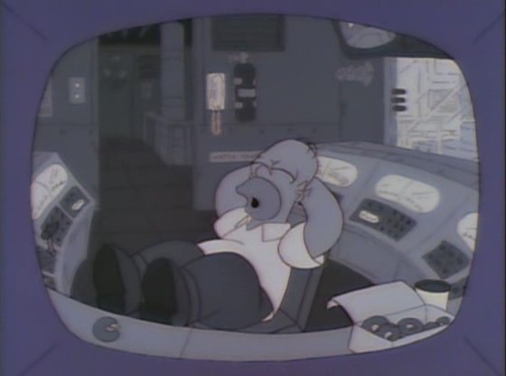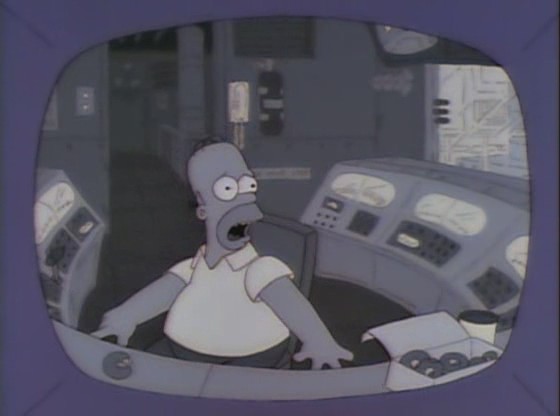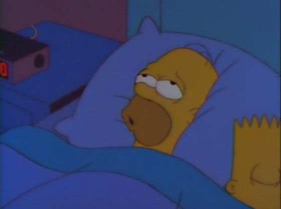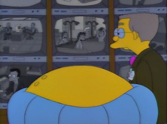Aquí vemos como los niños piden aterrados, dormir con sus padres, y Homer al conciliar el sueño, tiene una terrible pesadilla donde es despedido. Lo más gracioso es la cara de panolis que se le queda al descubrir que está vigilado por una cámara constantemente, jeje, cómo si no lo supiera.