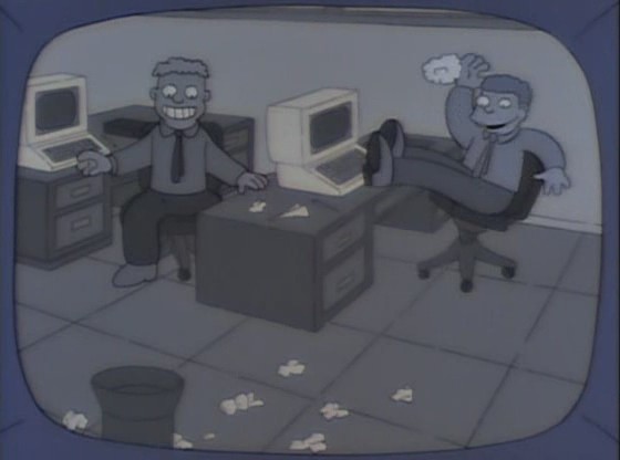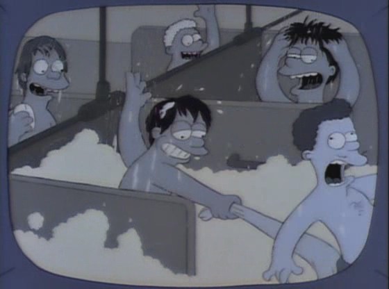También me hace mucha gracia estas secuencias donde el señor Burns se horroriza al ver a sus empleados holgazaneando y con un nulo rendimiento laboral (la de la ducha es la monda).