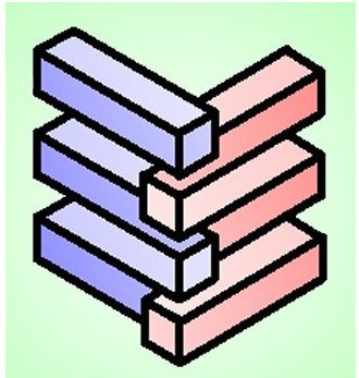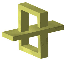 Otra figura imposible, en la que podemos apreciar diferentes perspectivas. ¿Un cuadrado de madera ancho pasando a través de una tabla más fina?