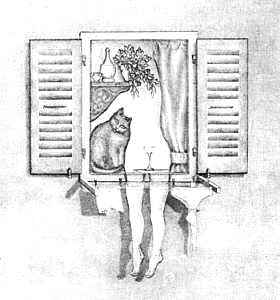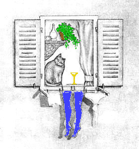 Esta otra imagen es parecida. Nos parece estar viendo a una mujer desnudándose a través de una ventana. Pero desde otra perspectiva, que sería más real, sólo vemos un gato asomado a la ventana, al lado una copa de champán, ropa tendida en las cuerdas (entre ella unas medias) y una estantería donde entre otras cosas, vemos una maceta con una planta.
