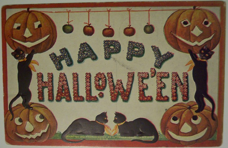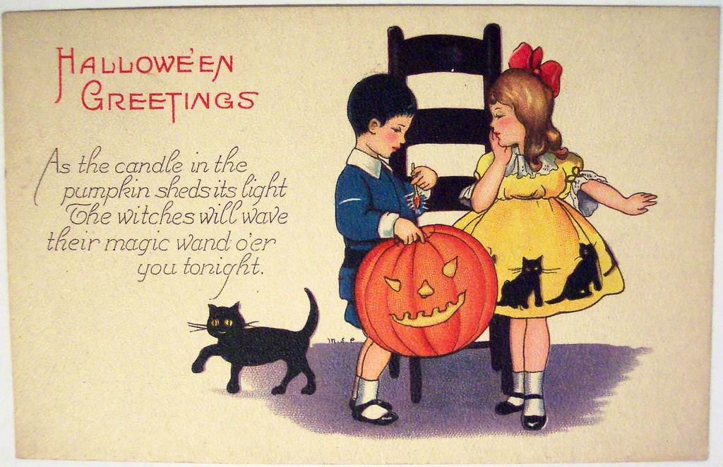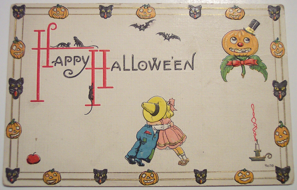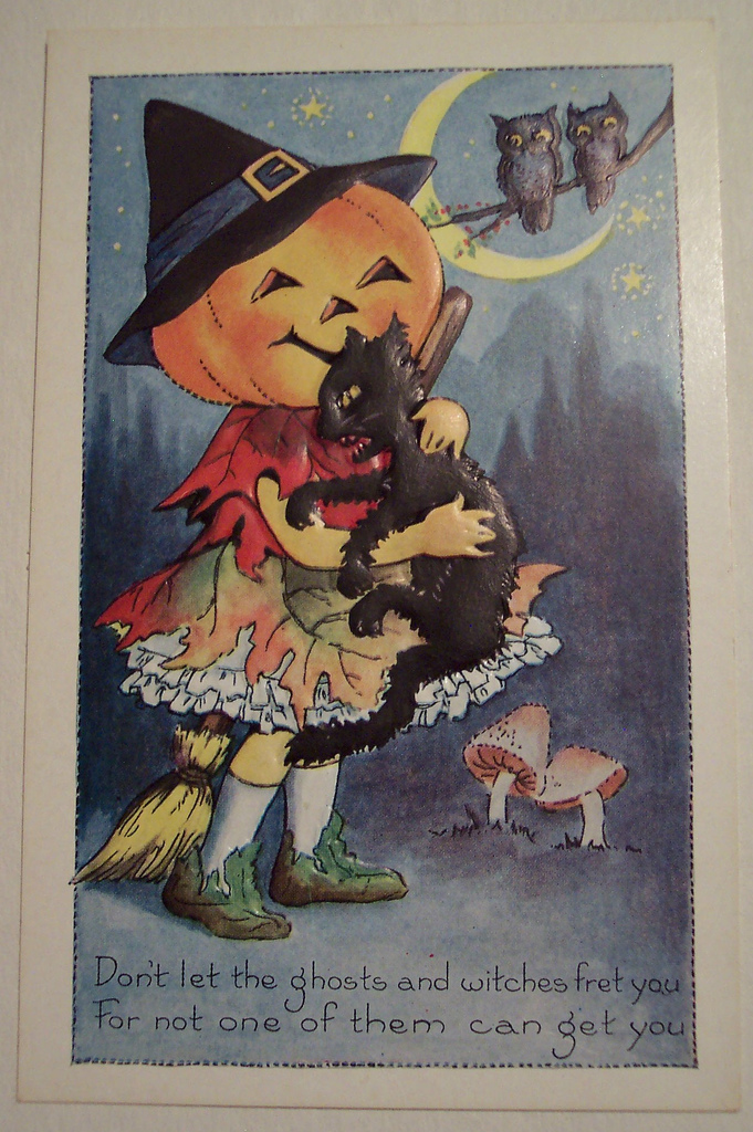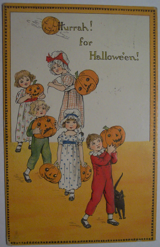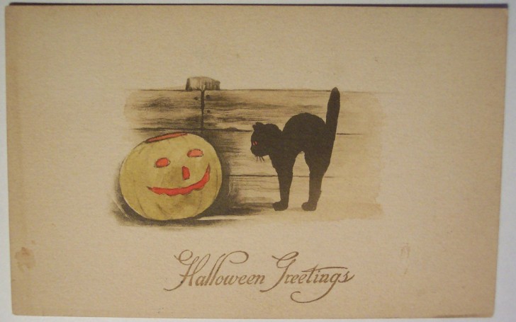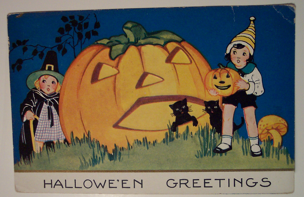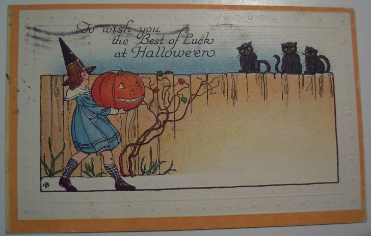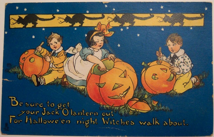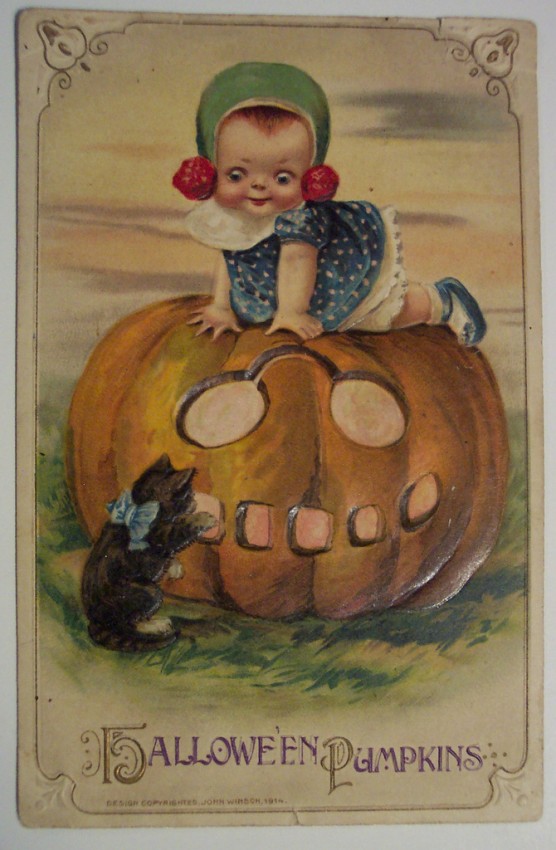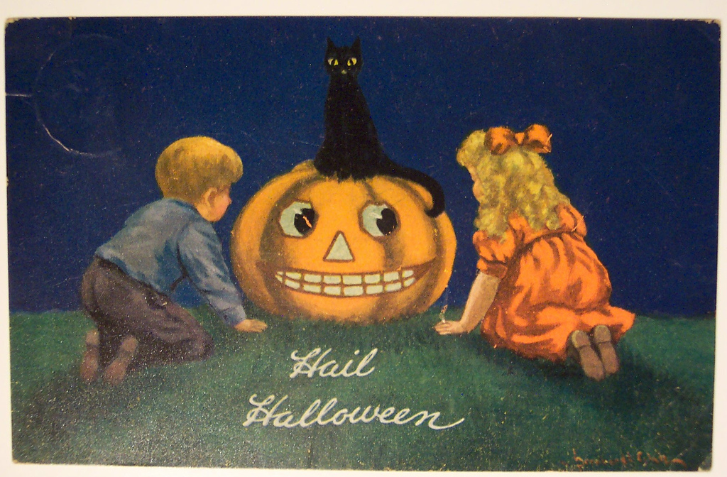 Presentamos varias postales de Halloween con un ambiente antiguo y vintage muy evocador, donde las calabazas, tiernos infantes, gatos, brujas y demás elementos tenebrosos se dan cita.