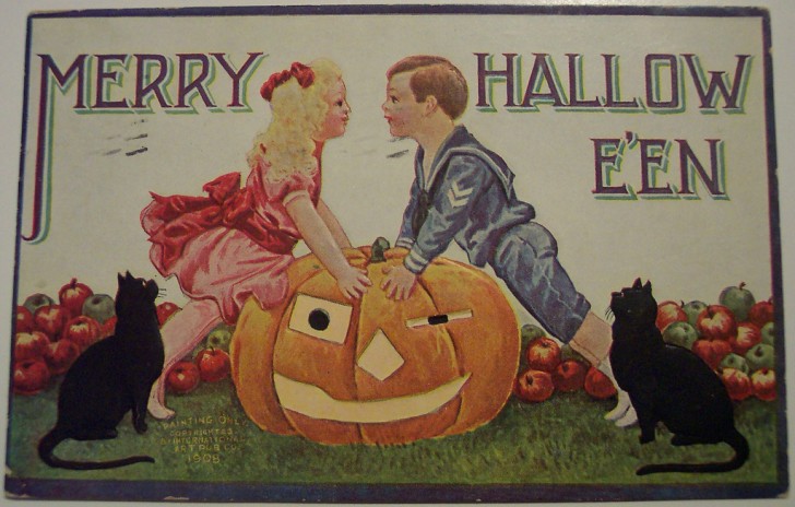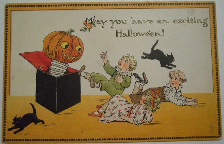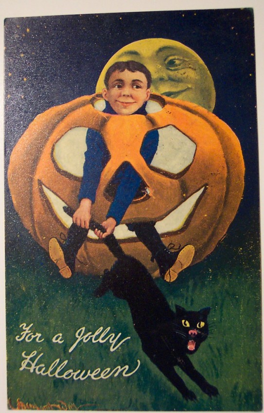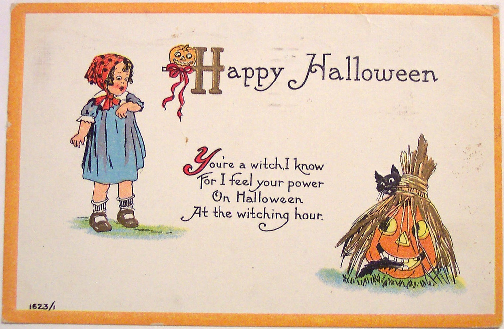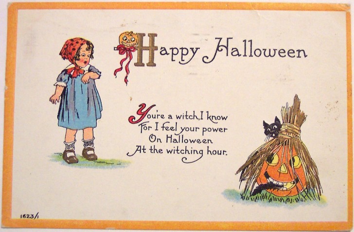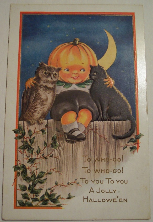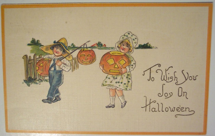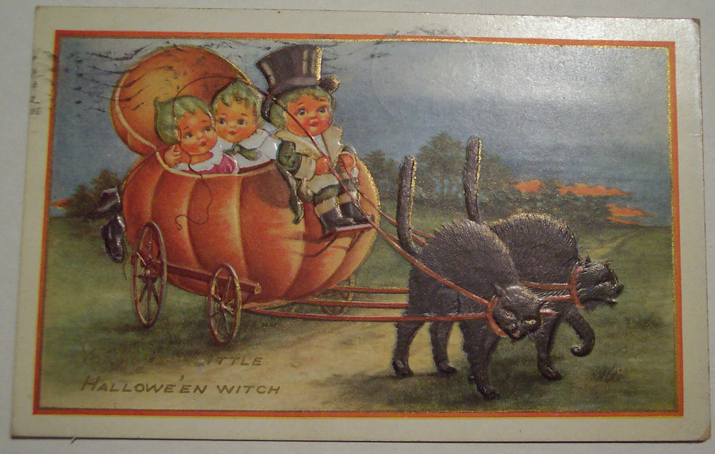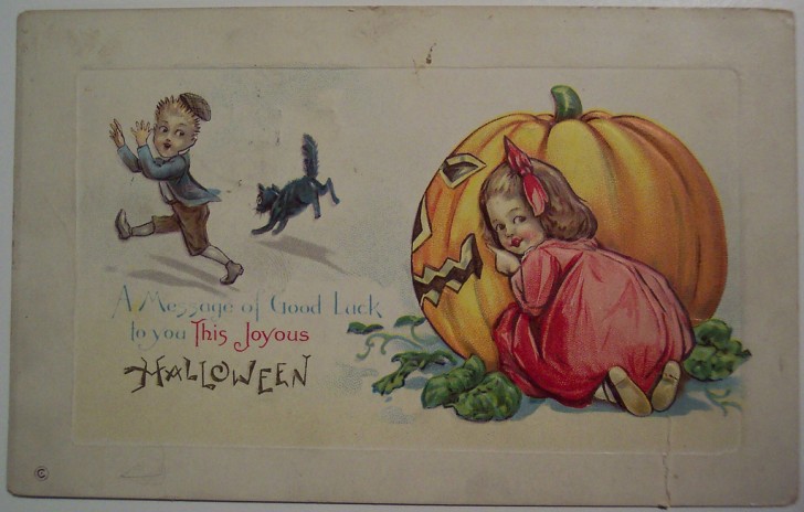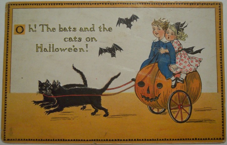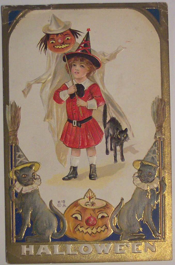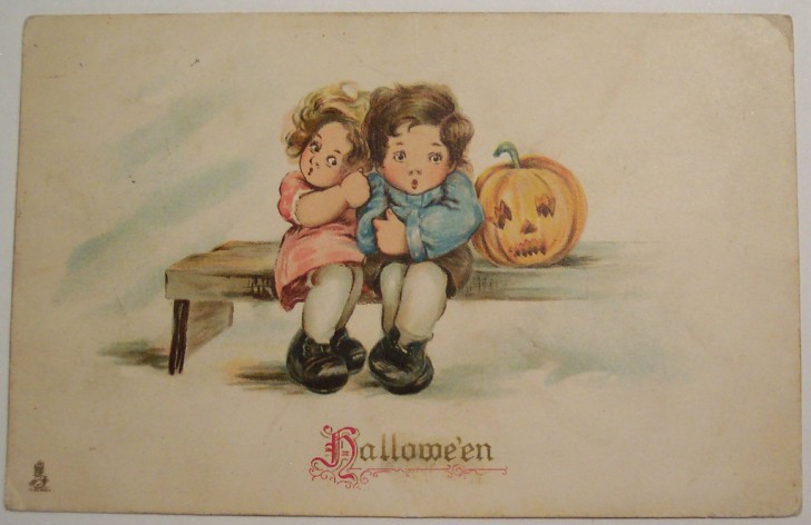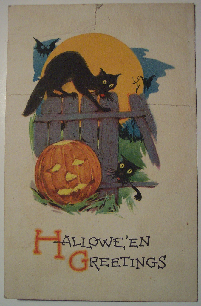 Presentamos varias postales de Halloween con un ambiente antiguo y vintage muy evocador, donde las calabazas, tiernos infantes, gatos, brujas y demás elementos tenebrosos se dan cita.