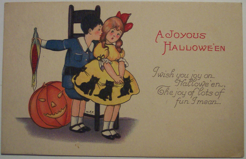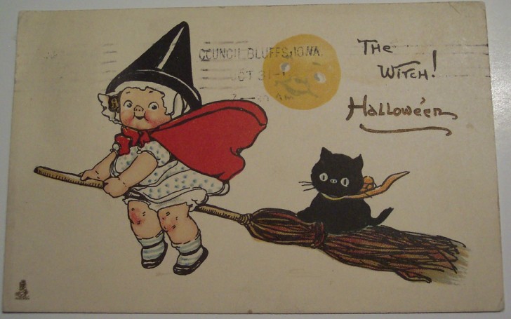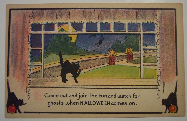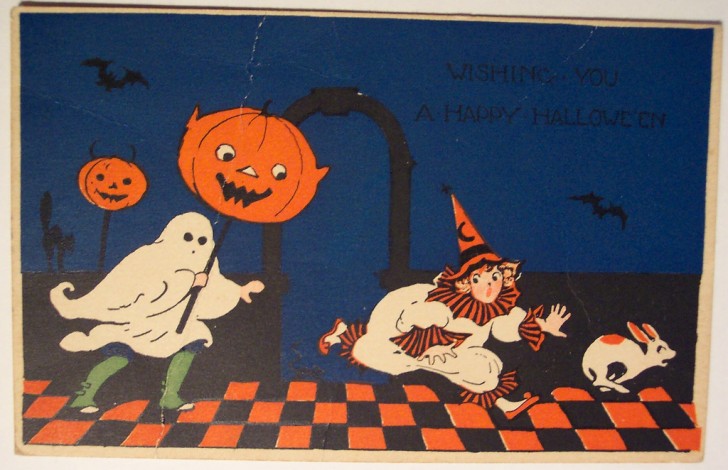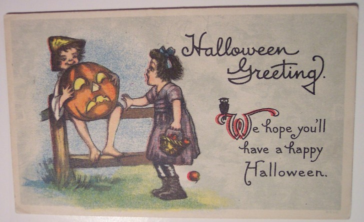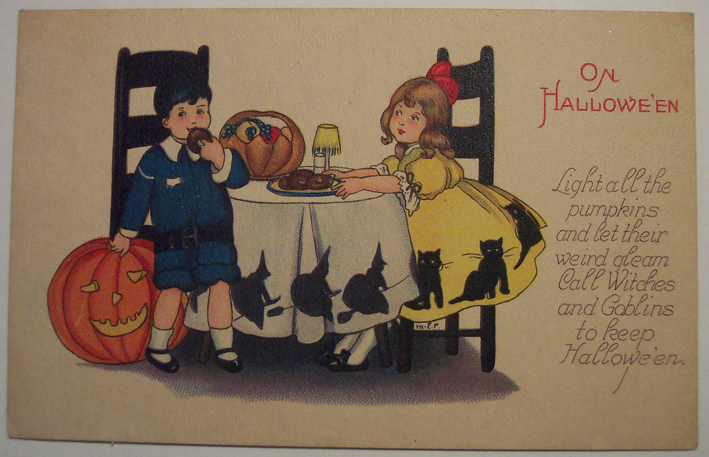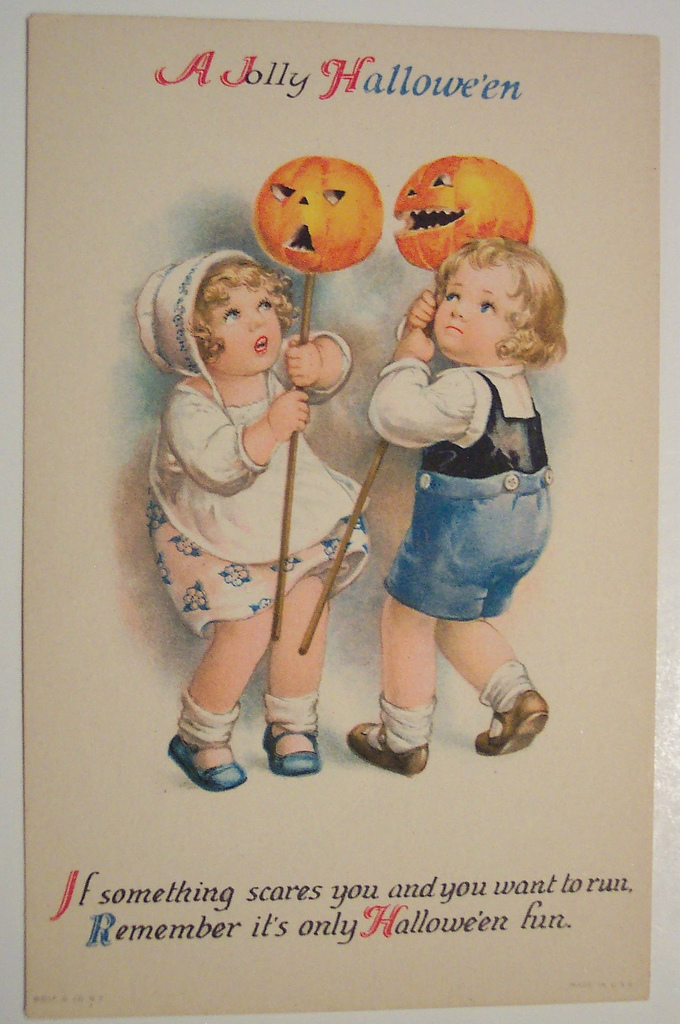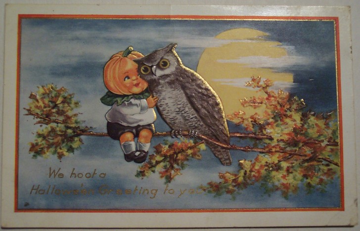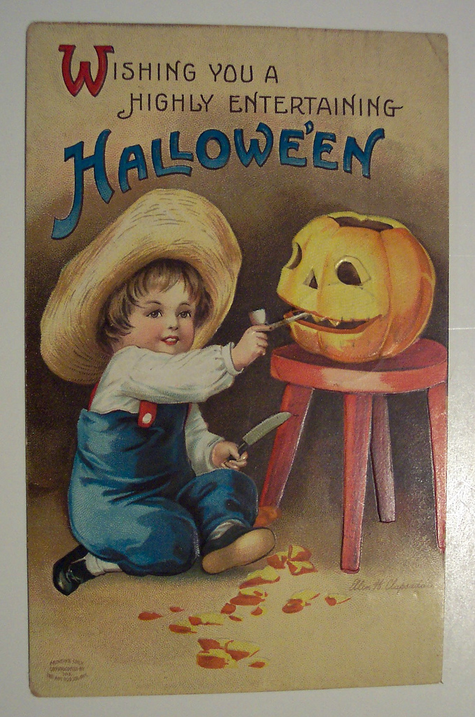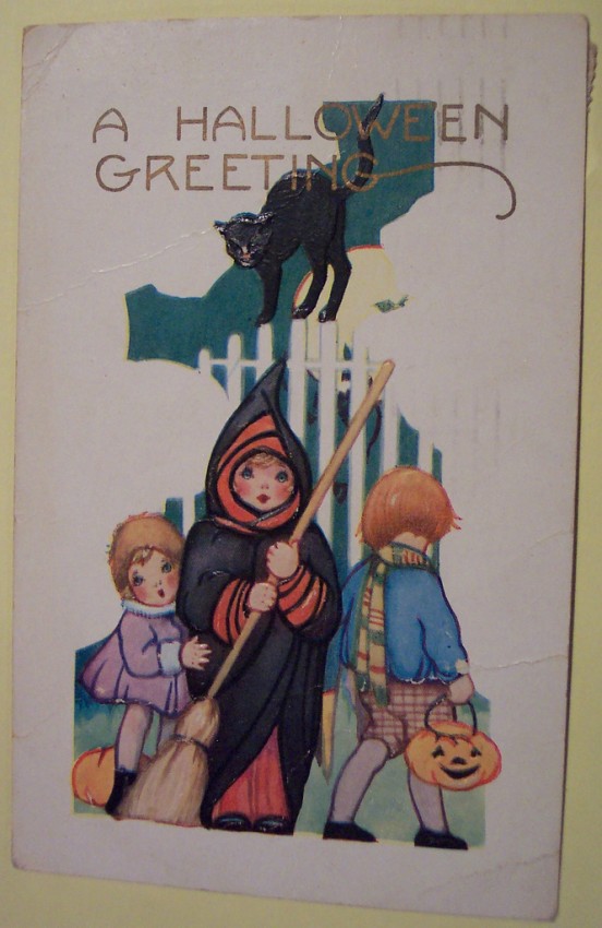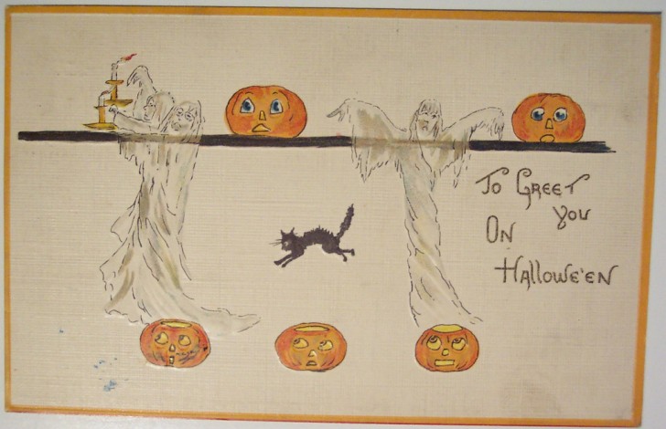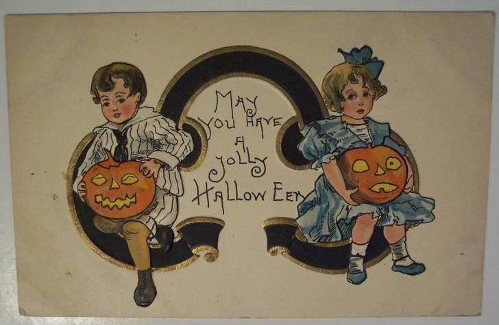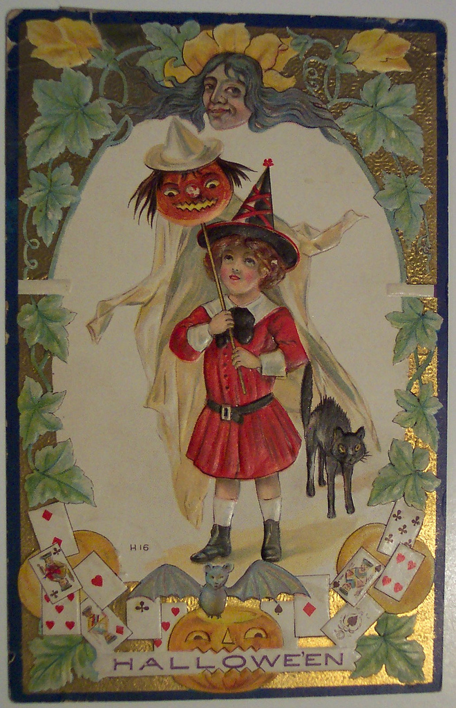 Presentamos varias postales de Halloween con un ambiente antiguo y vintage muy evocador, donde las calabazas, tiernos infantes, gatos, brujas y demás elementos tenebrosos se dan cita.