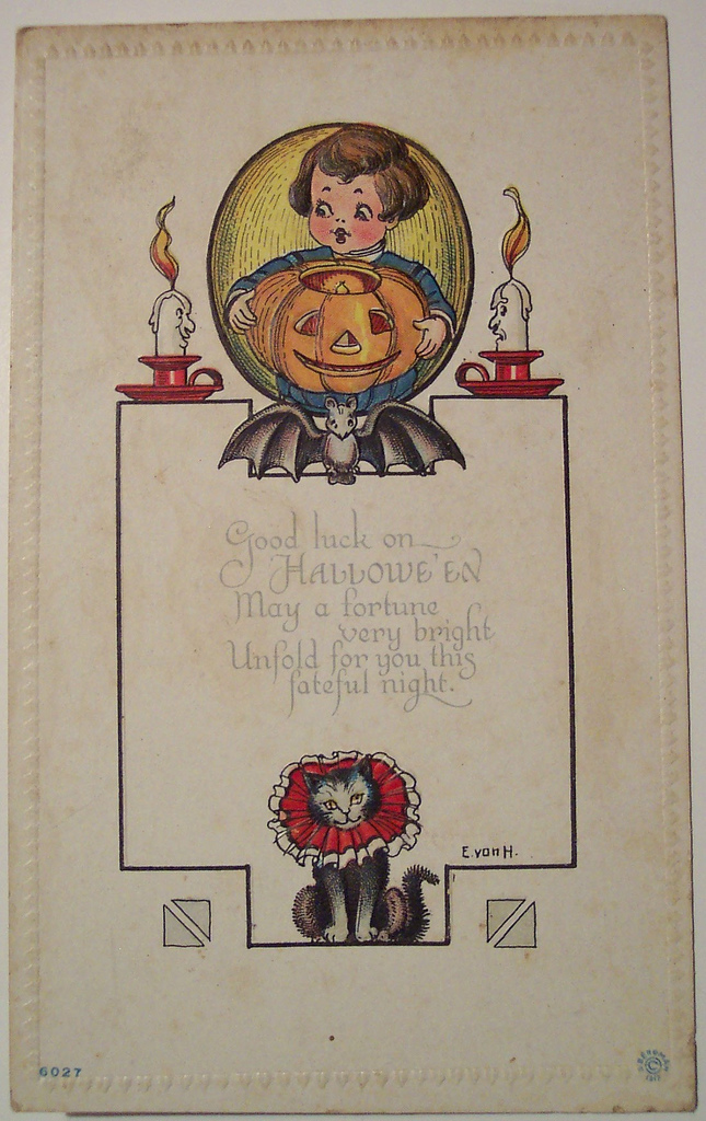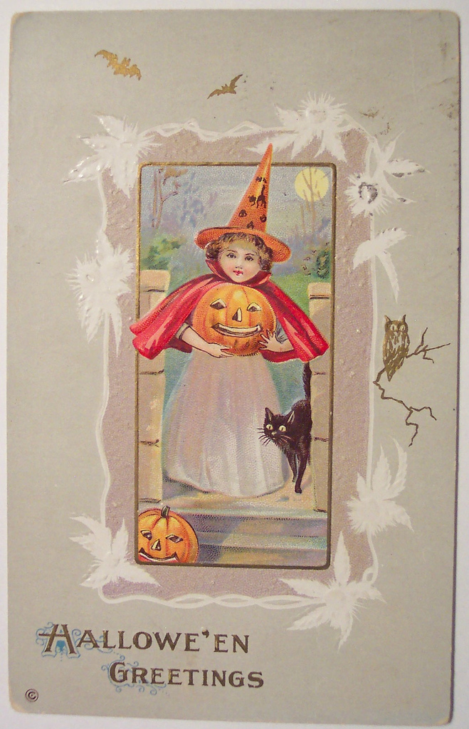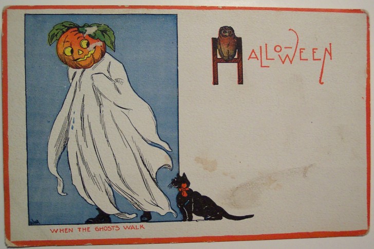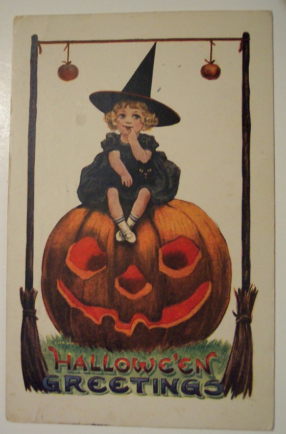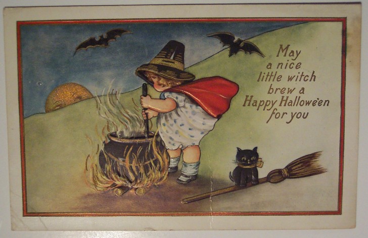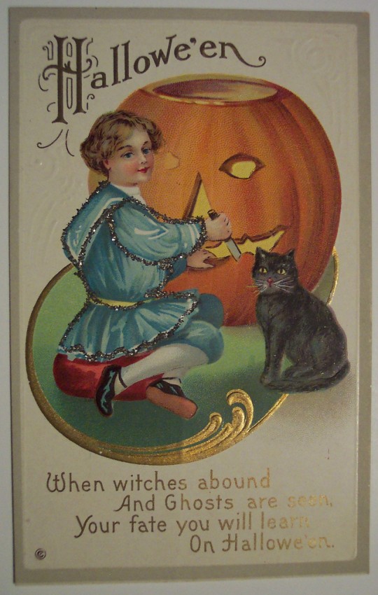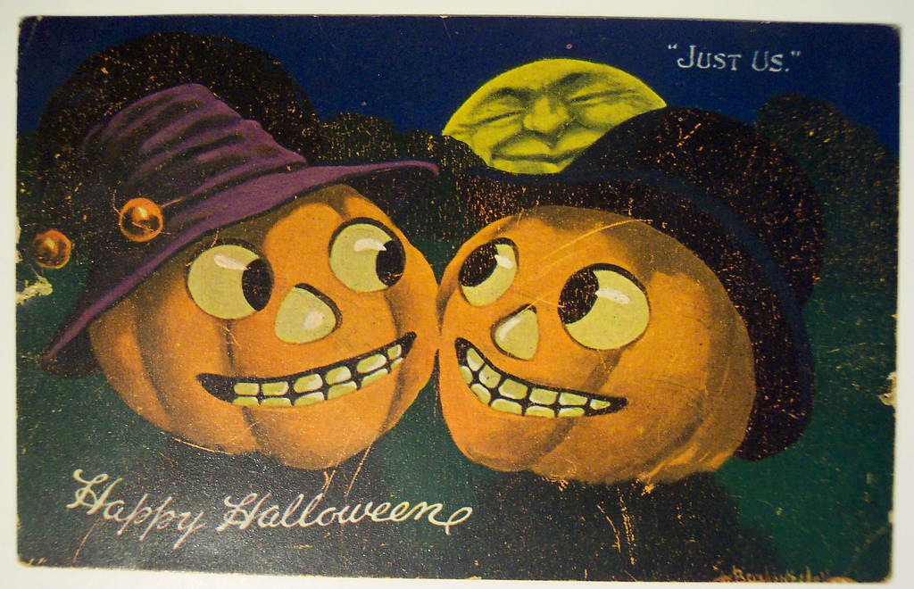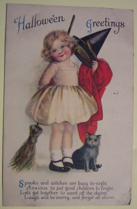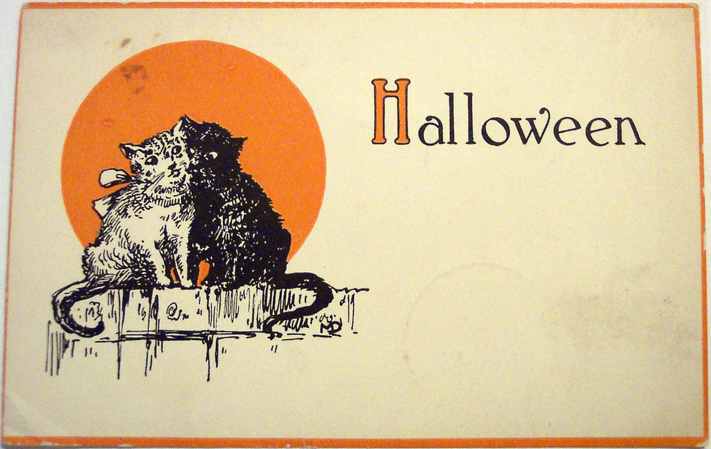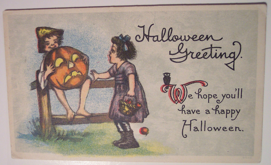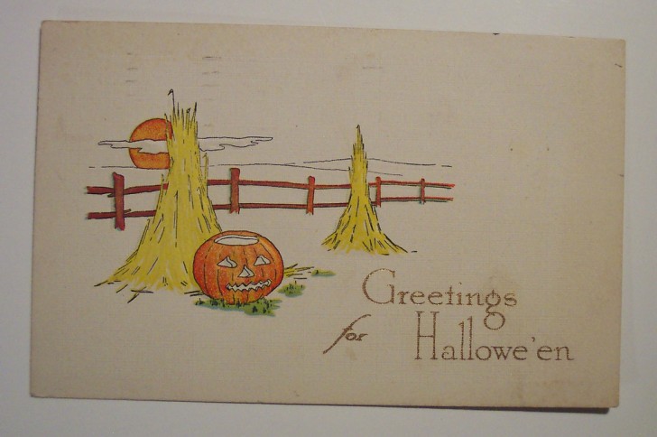 Presentamos varias postales de Halloween con un ambiente antiguo y vintage muy evocador, donde las calabazas, tiernos infantes, gatos, brujas y demás elementos tenebrosos se dan cita.