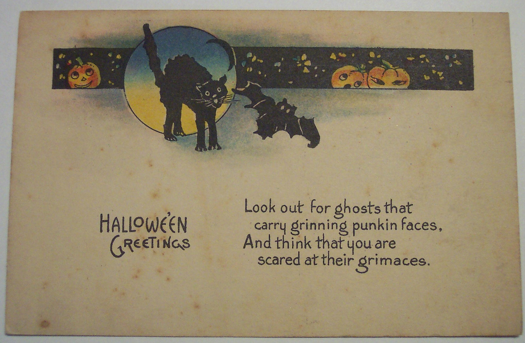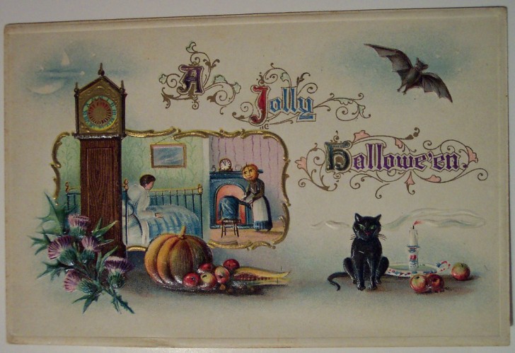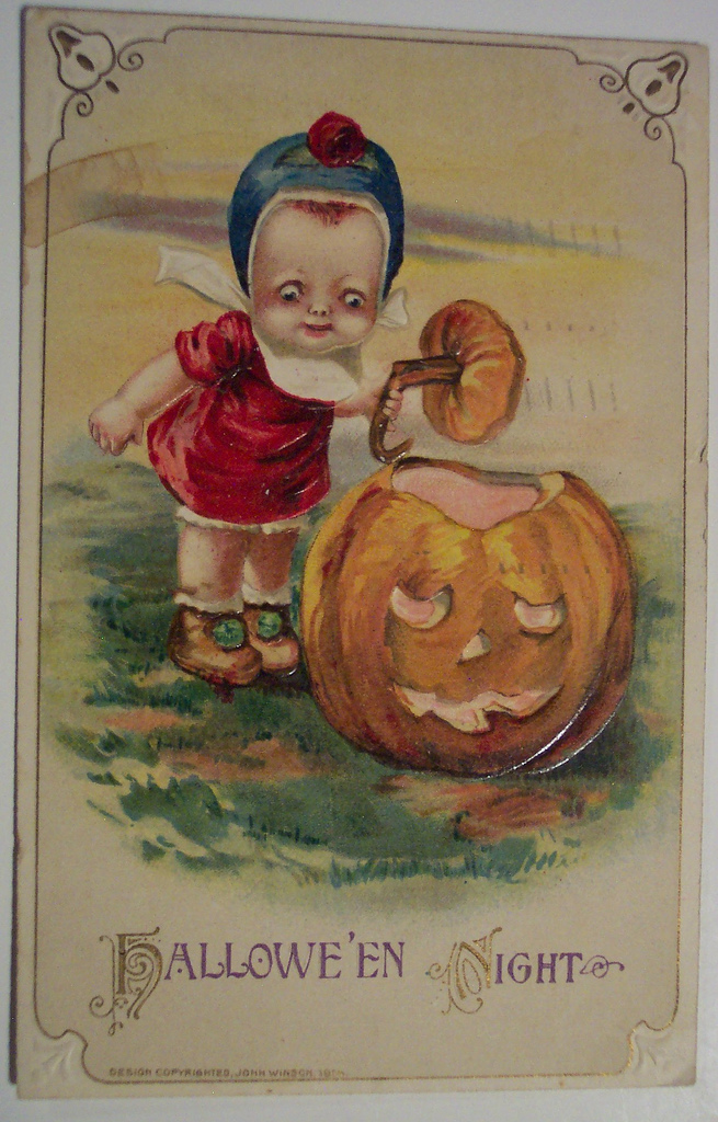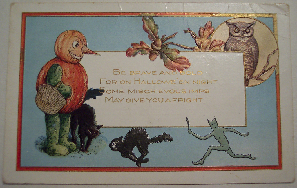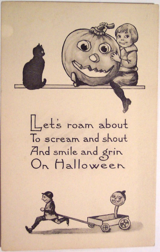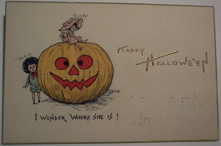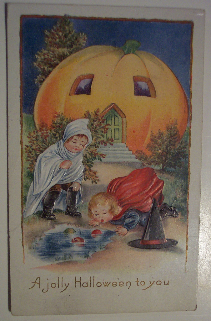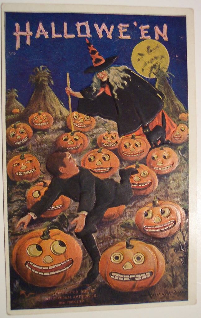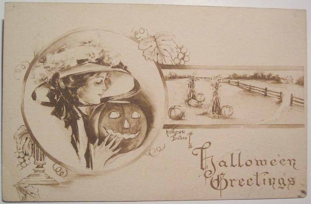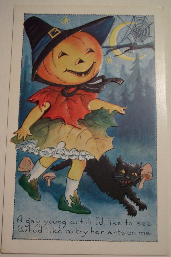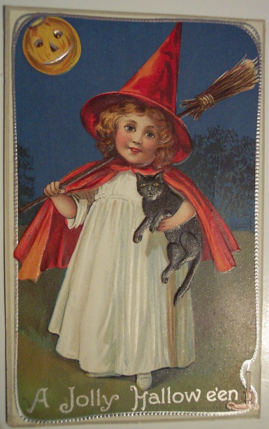Presentamos varias postales de Halloween con un ambiente antiguo y vintage muy evocador, donde las calabazas, tiernos infantes, gatos, brujas y demás elementos tenebrosos se dan cita.