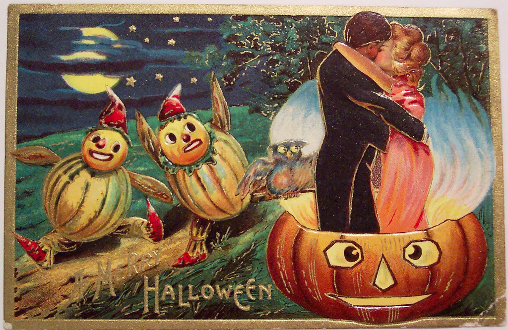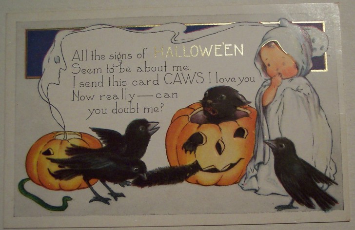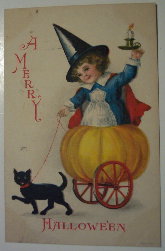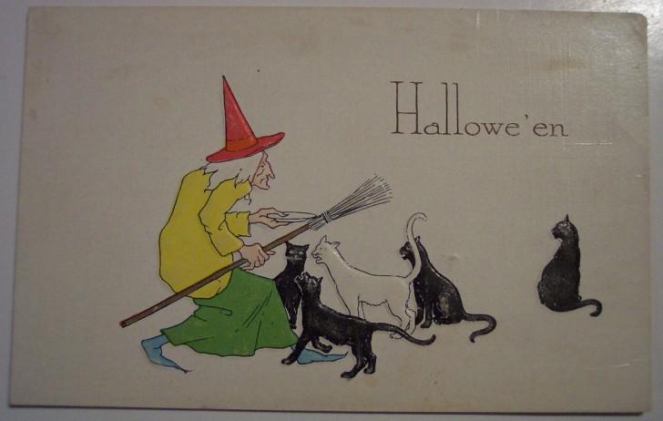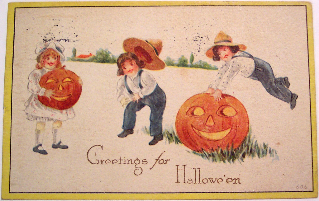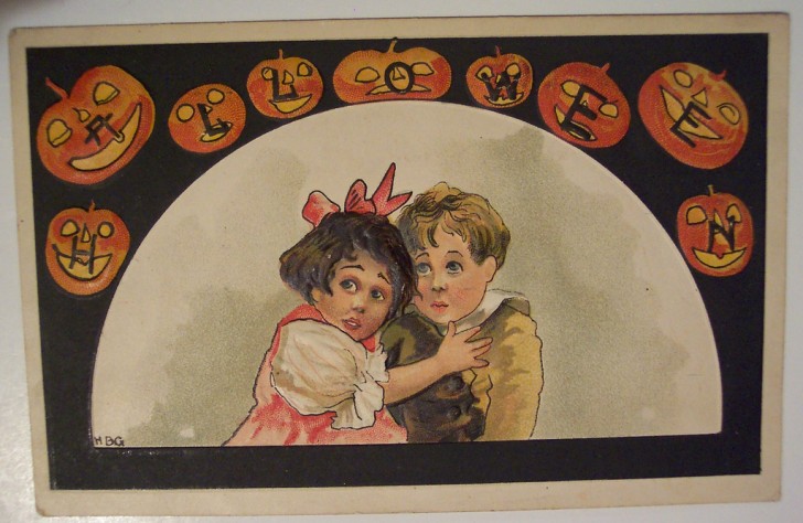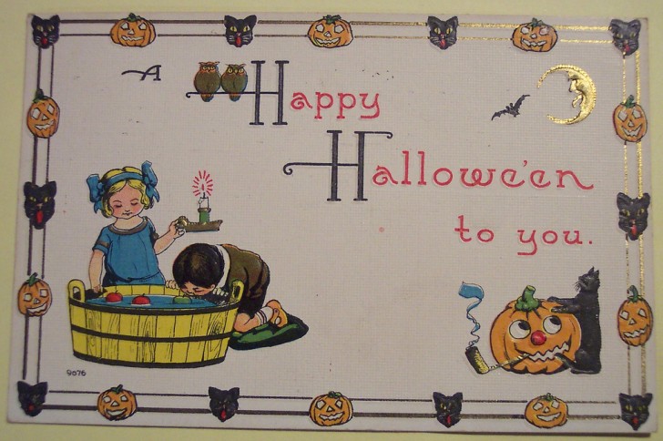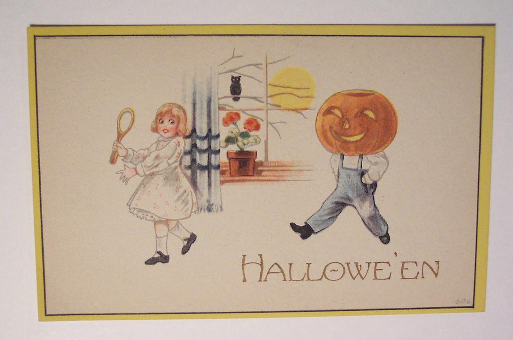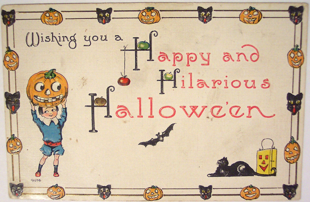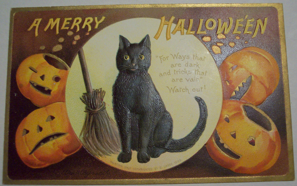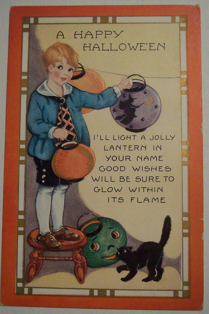 Presentamos varias postales de Halloween con un ambiente antiguo y vintage muy evocador, donde las calabazas, tiernos infantes, gatos, brujas y demás elementos tenebrosos se dan cita.