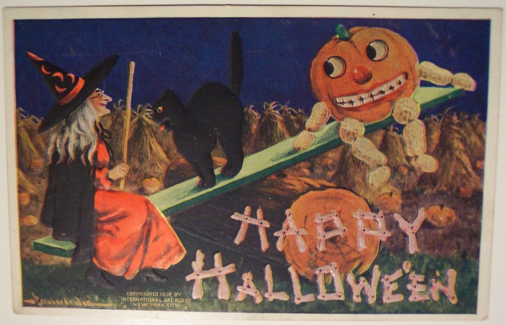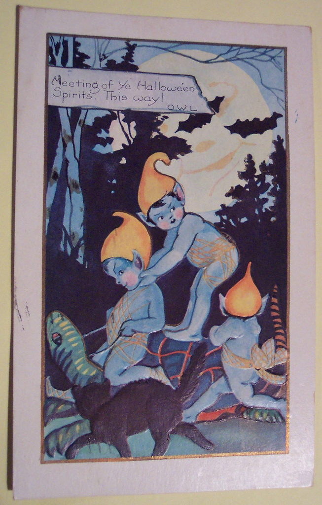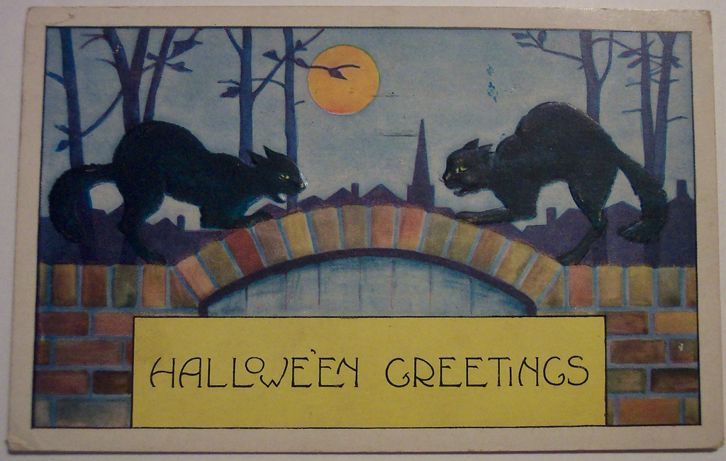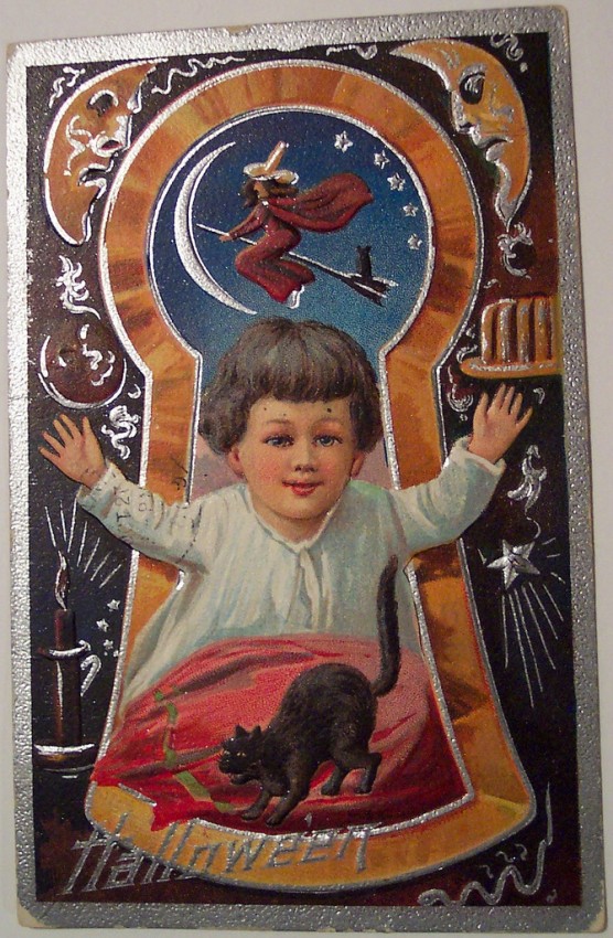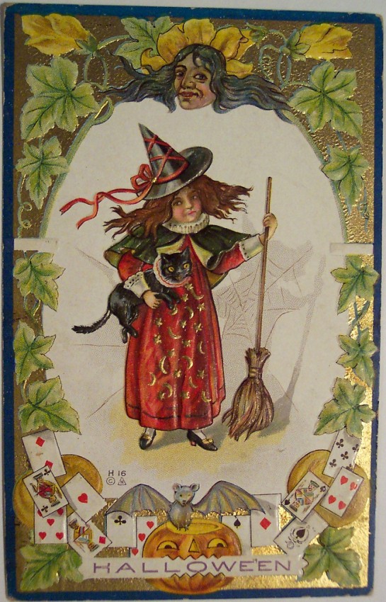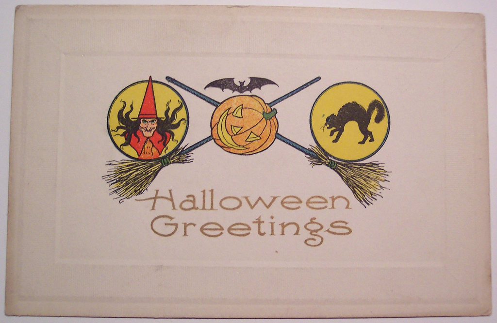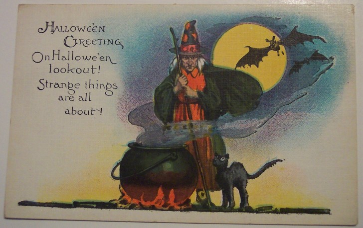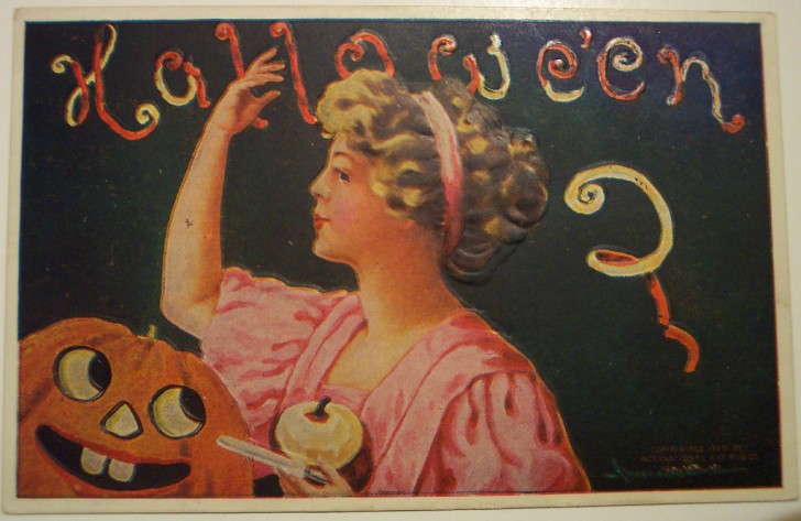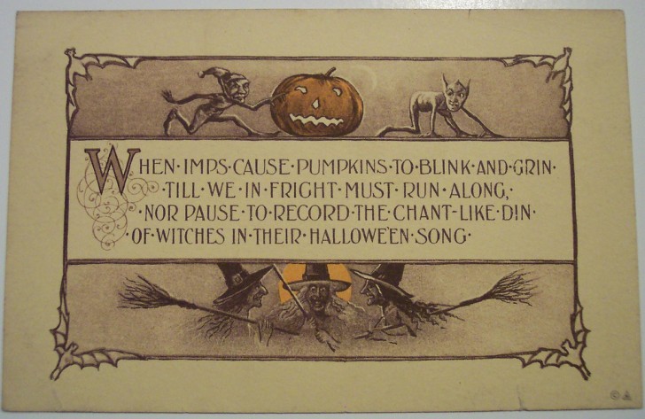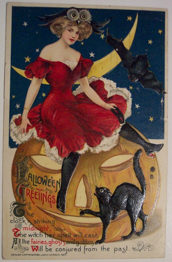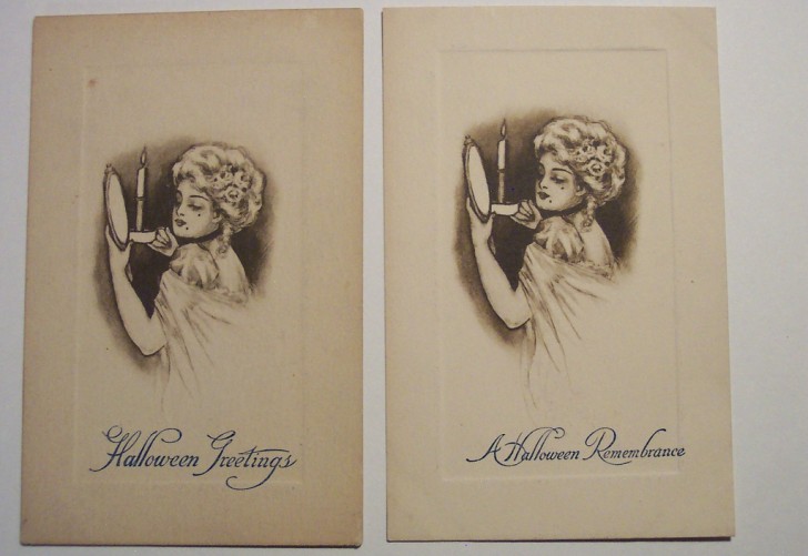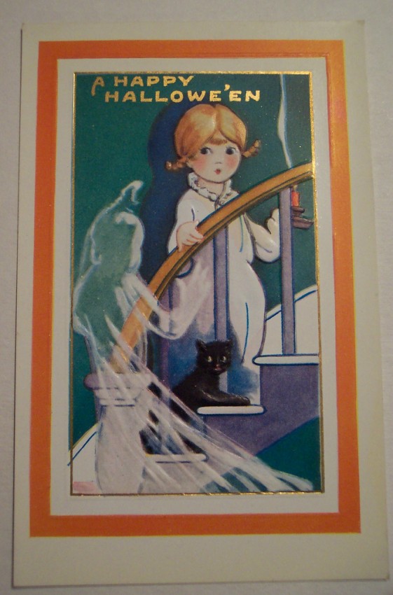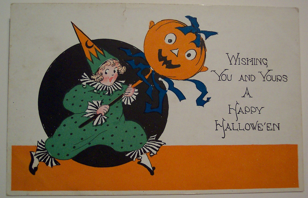 Presentamos varias postales de Halloween con un ambiente antiguo y vintage muy evocador, donde las calabazas, tiernos infantes, gatos, brujas y demás elementos tenebrosos se dan cita.