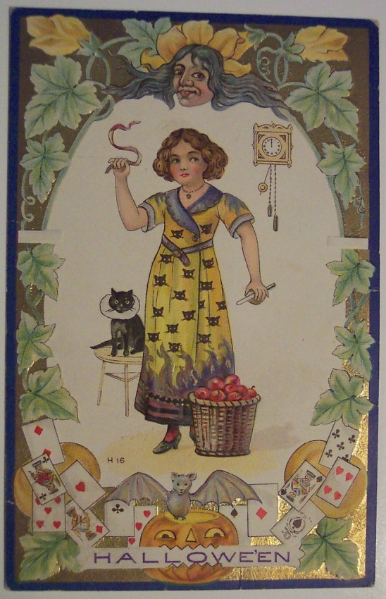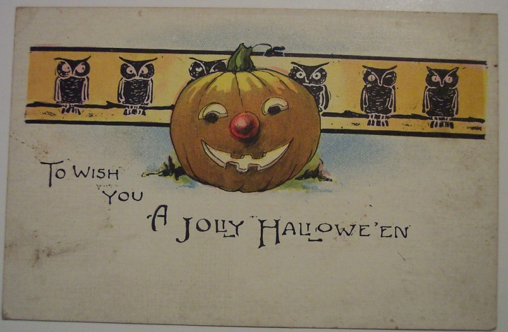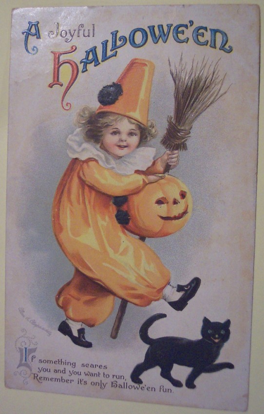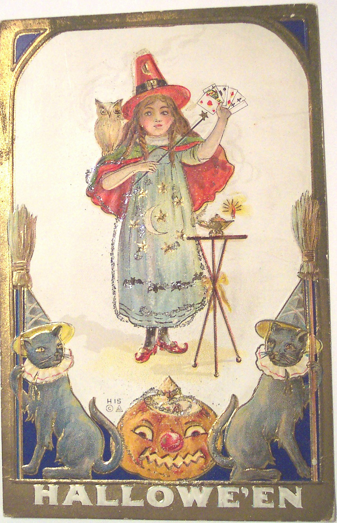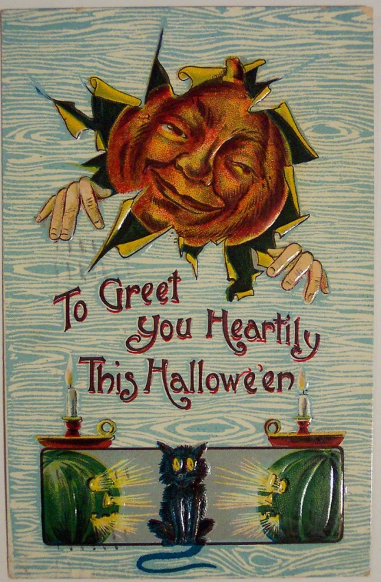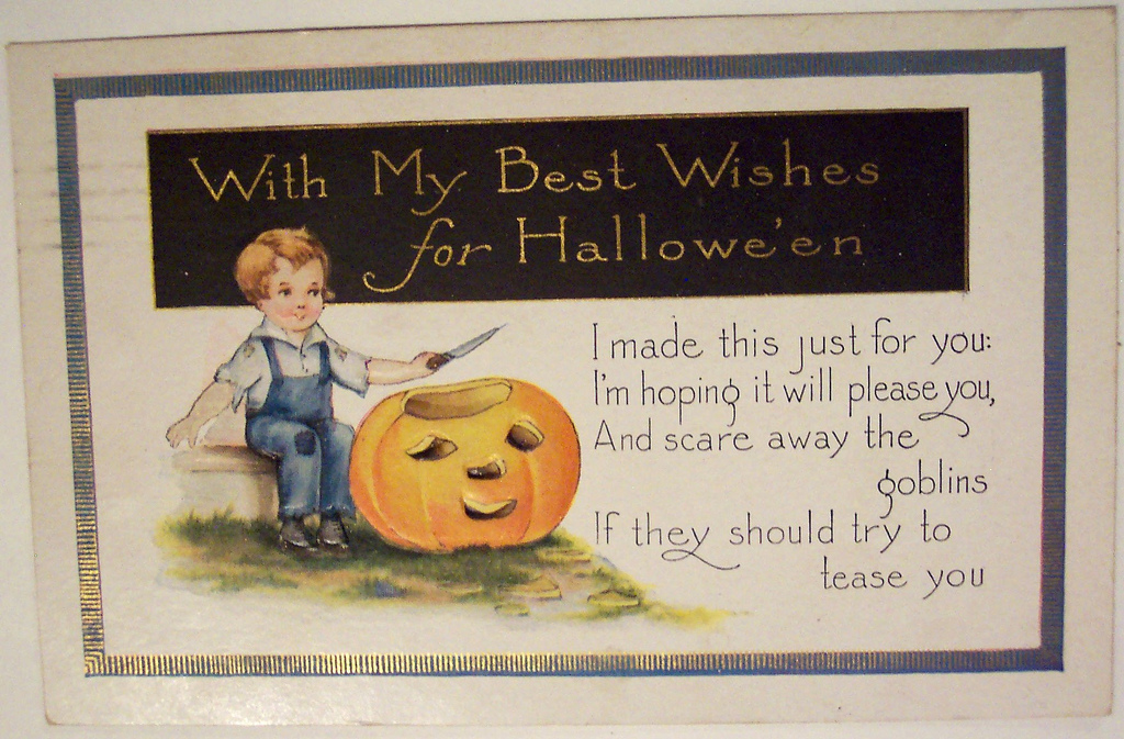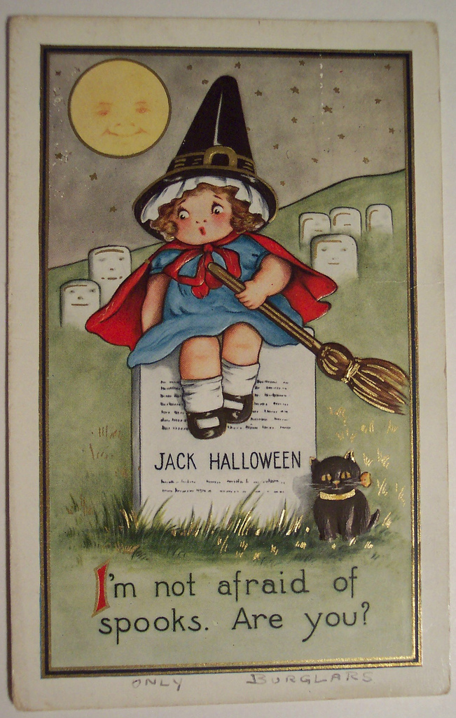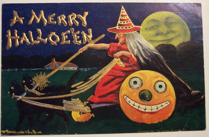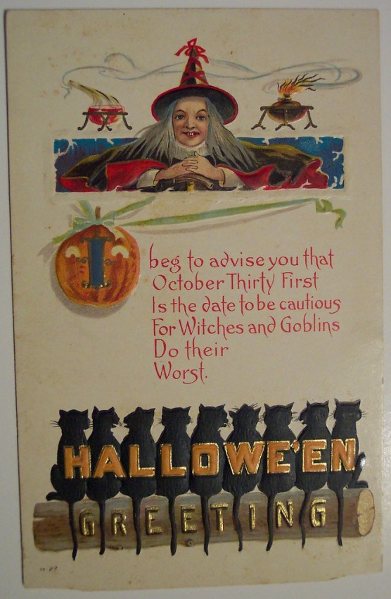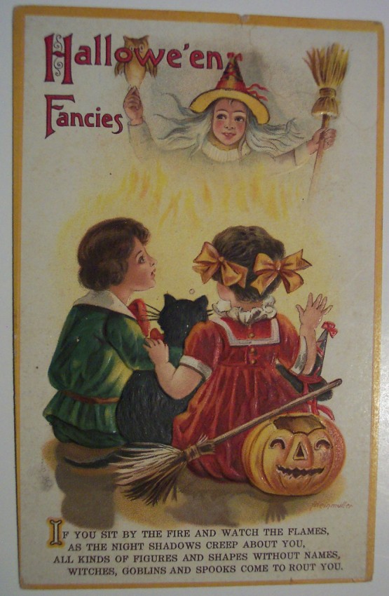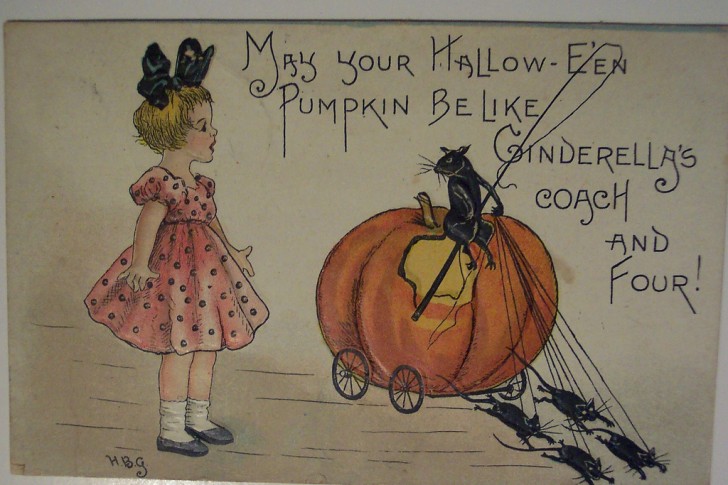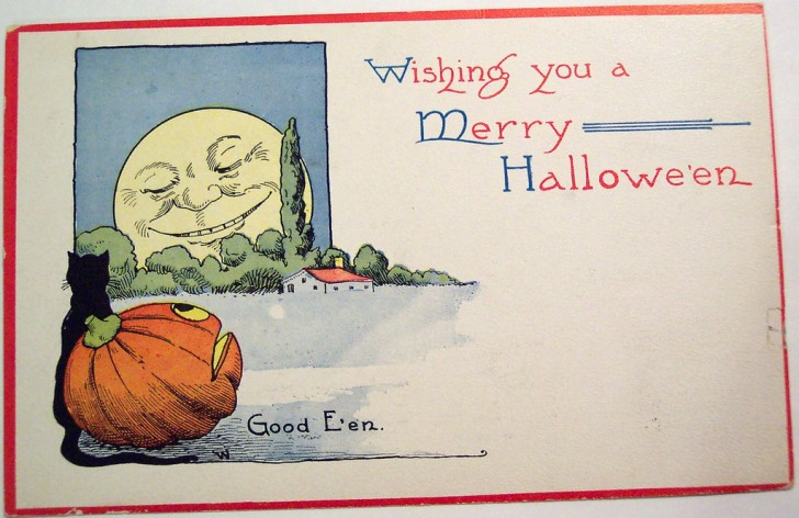 Presentamos varias postales de Halloween con un ambiente antiguo y vintage muy evocador, donde las calabazas, tiernos infantes, gatos, brujas y demás elementos tenebrosos se dan cita.