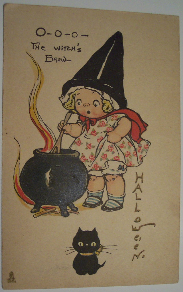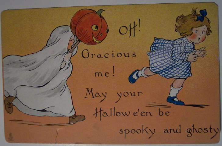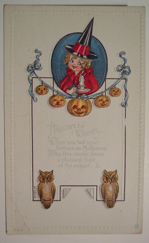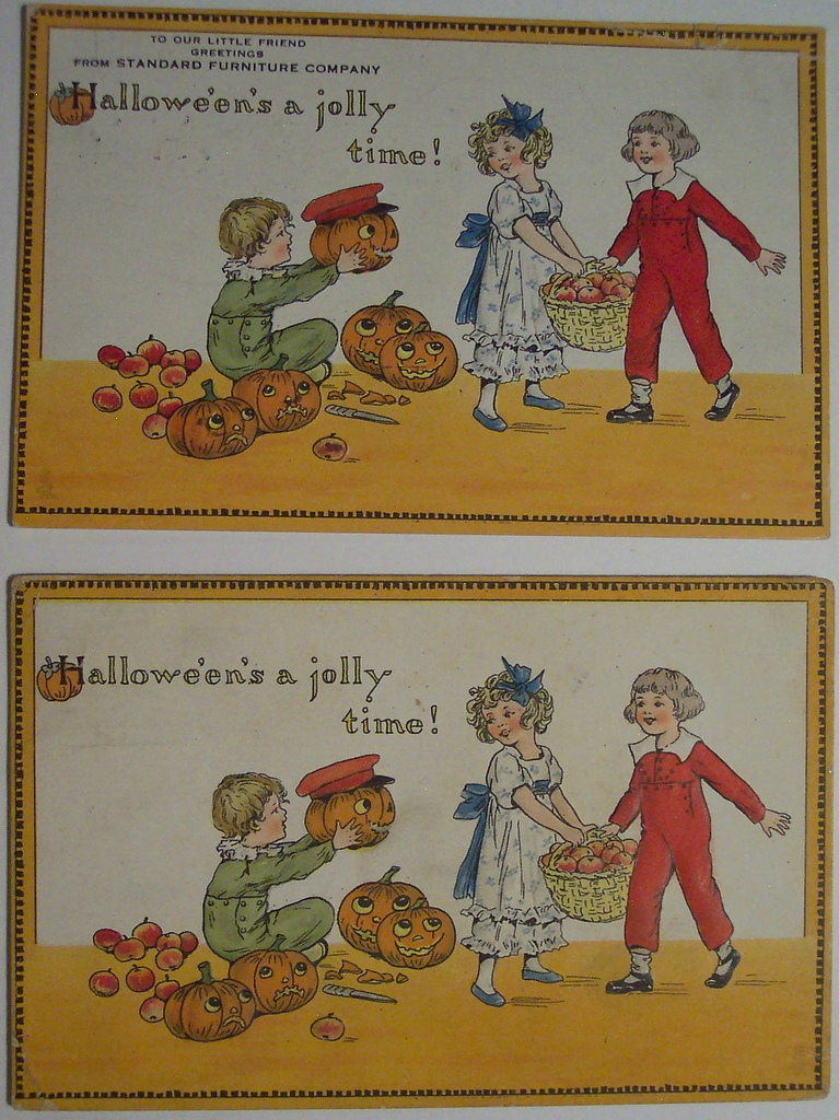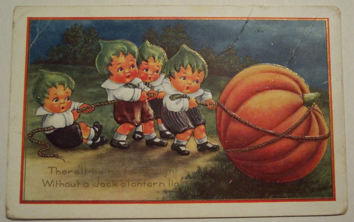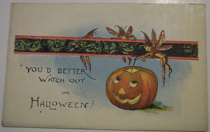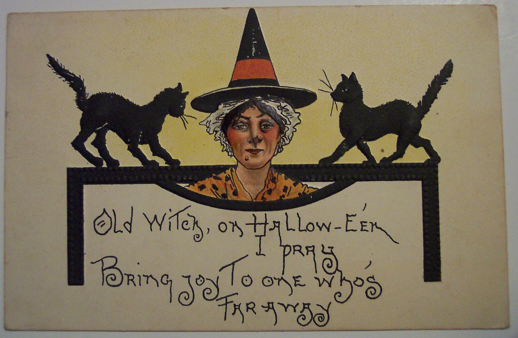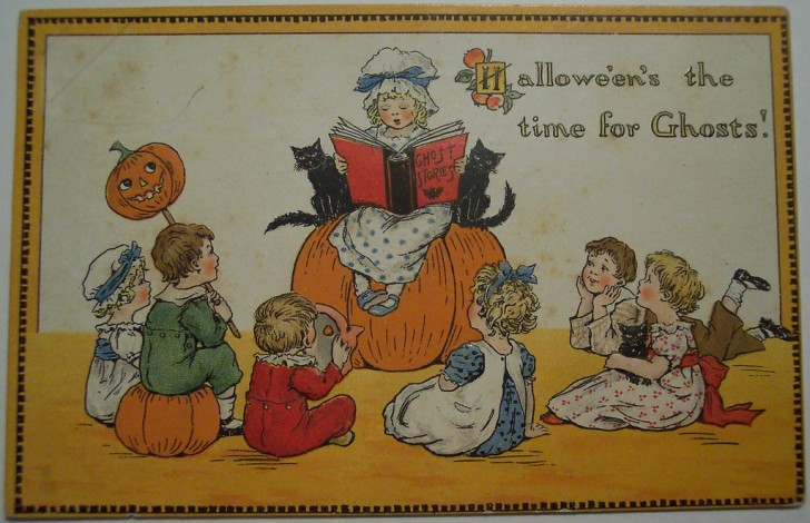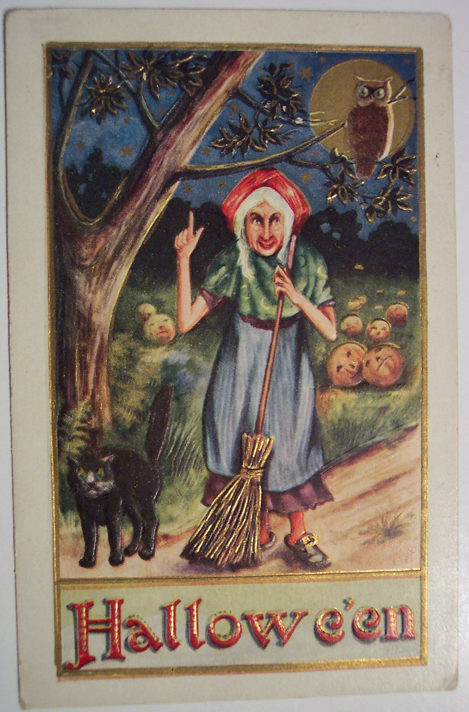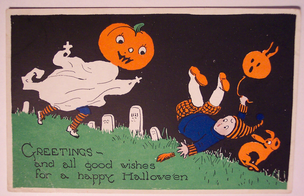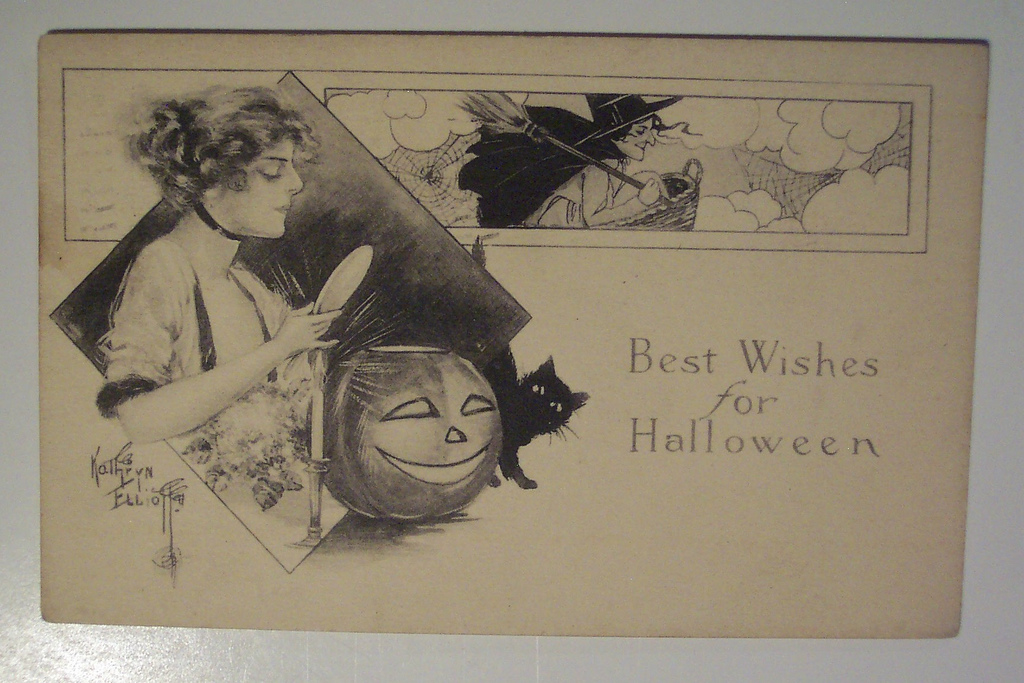 Presentamos varias postales de Halloween con un ambiente antiguo y vintage muy evocador, donde las calabazas, tiernos infantes, gatos, brujas y demás elementos tenebrosos se dan cita.