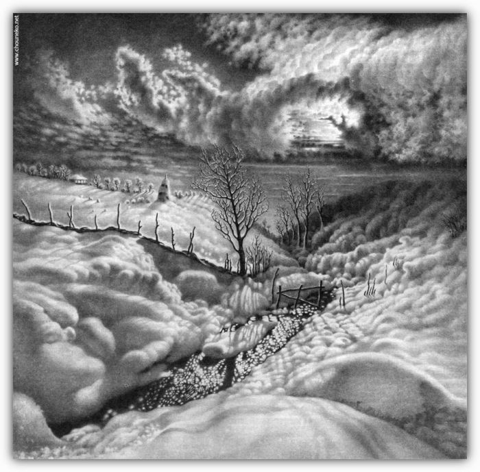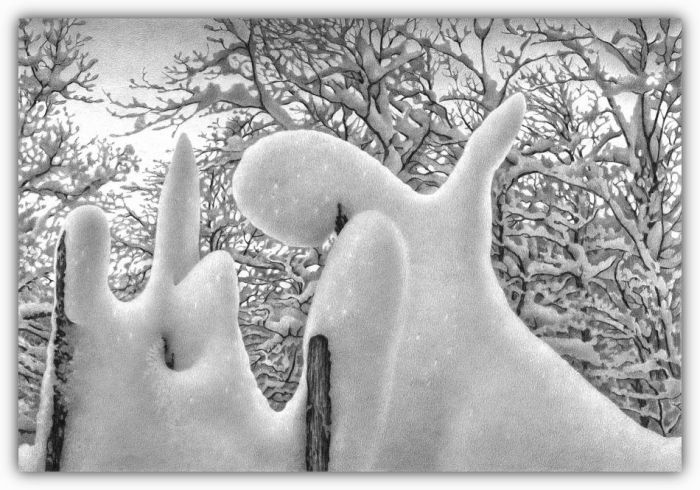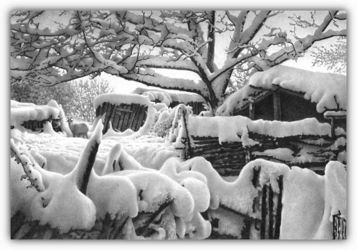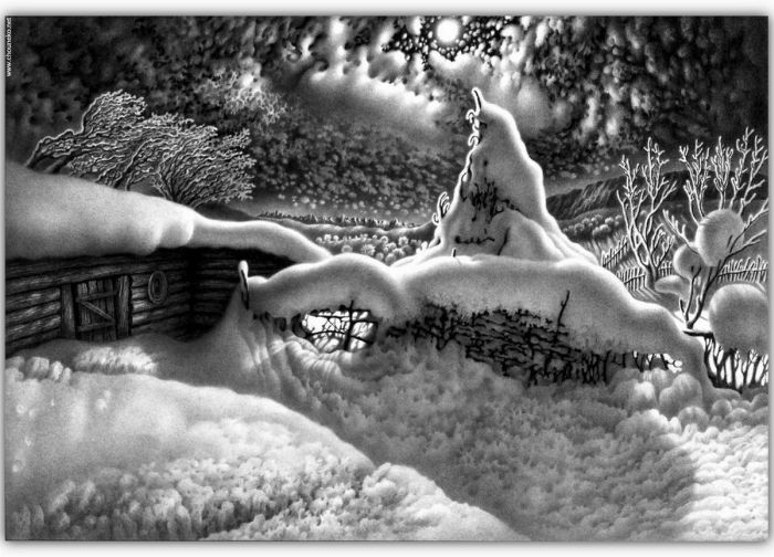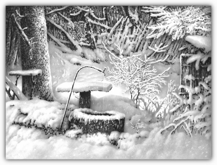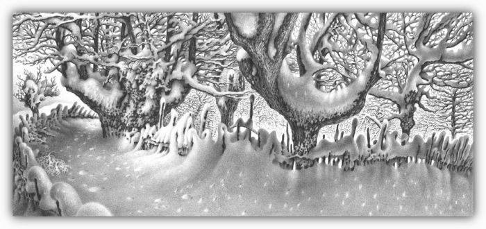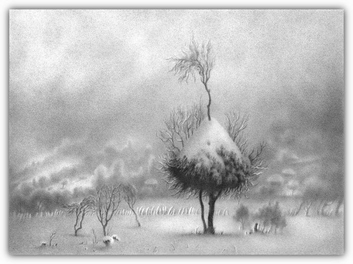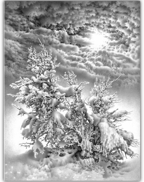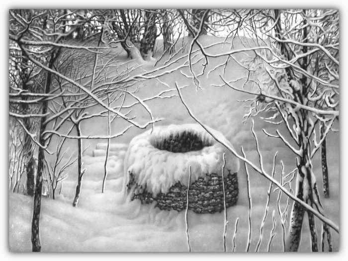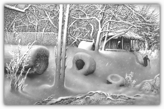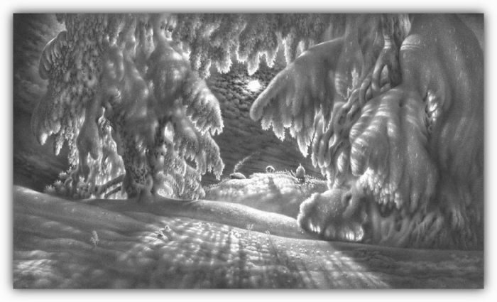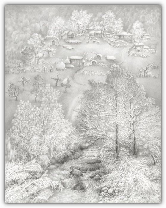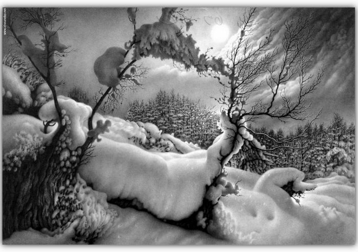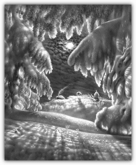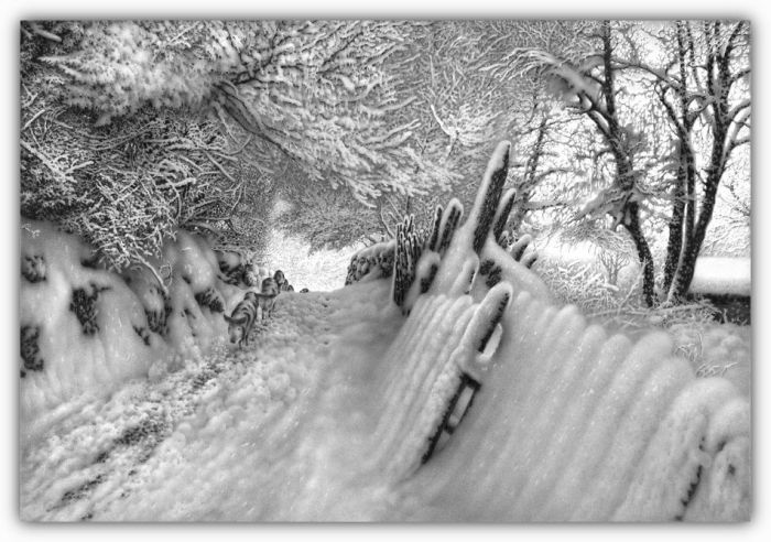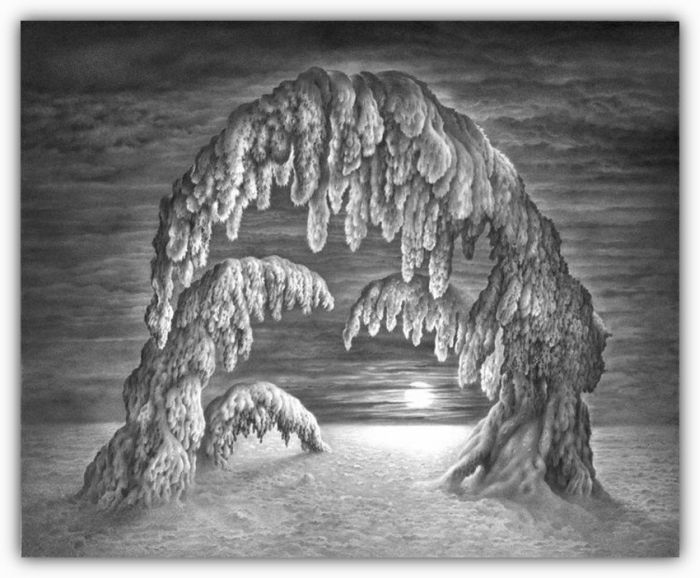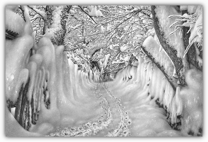 En estas bonitas imágenes podemos disfrutar de la paz y nostalgia de los paisajes naturales en invierno, aunque también nos produzcan esa sensación gélida que tanto repelús nos da en esta época tan fría. Los dibujos son en blanco y negro y están dibujados con una técnica impresionante en detalles.