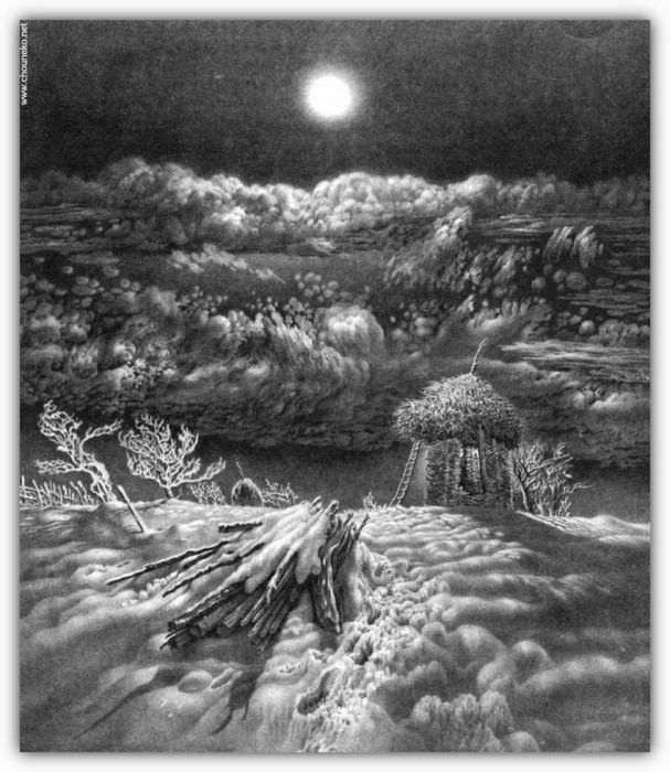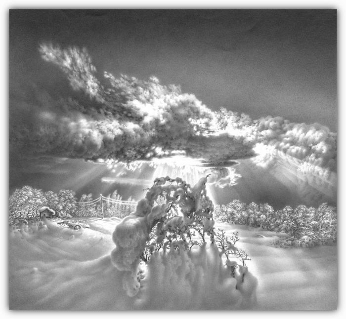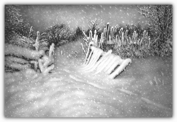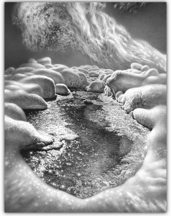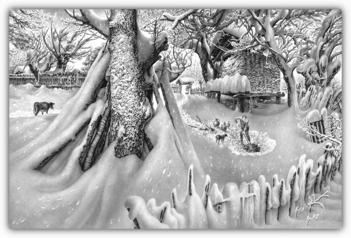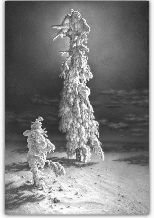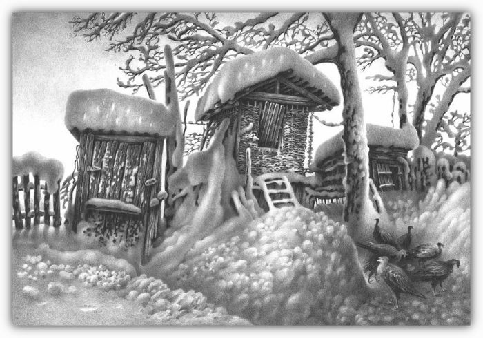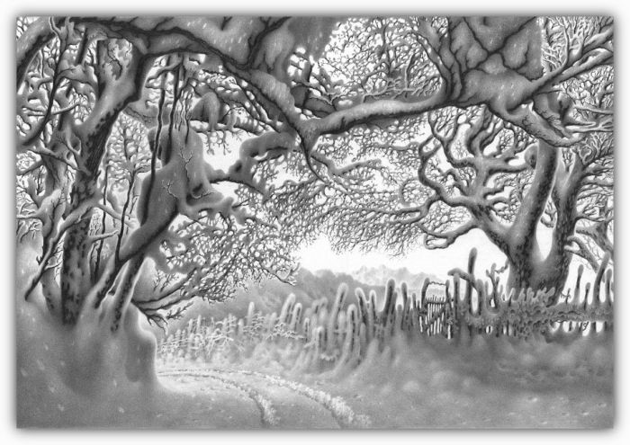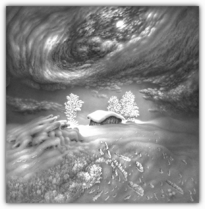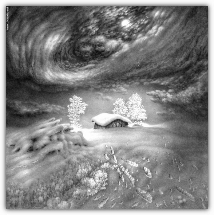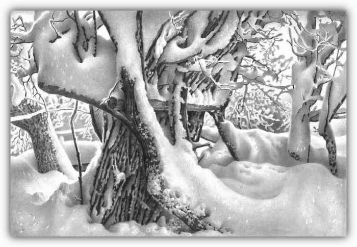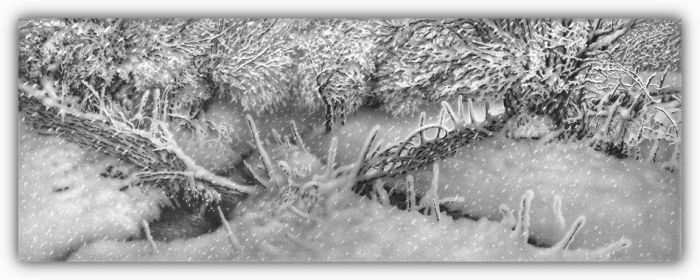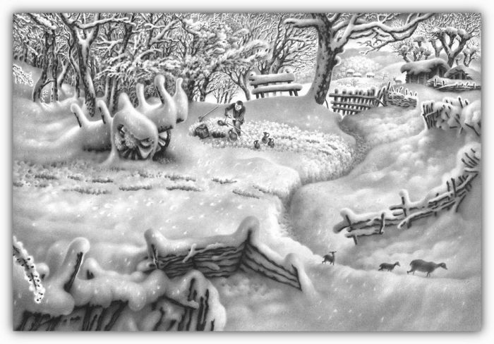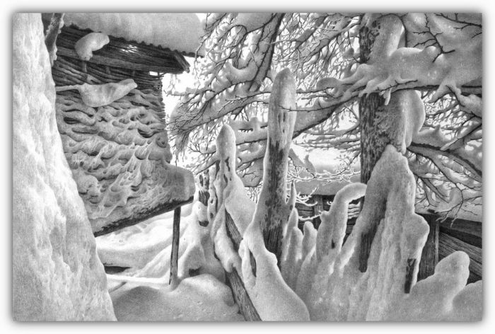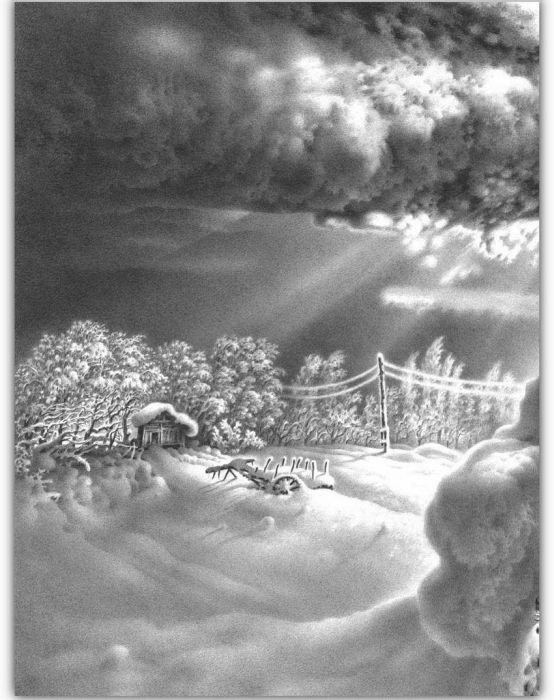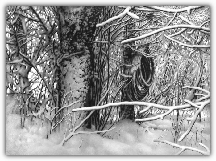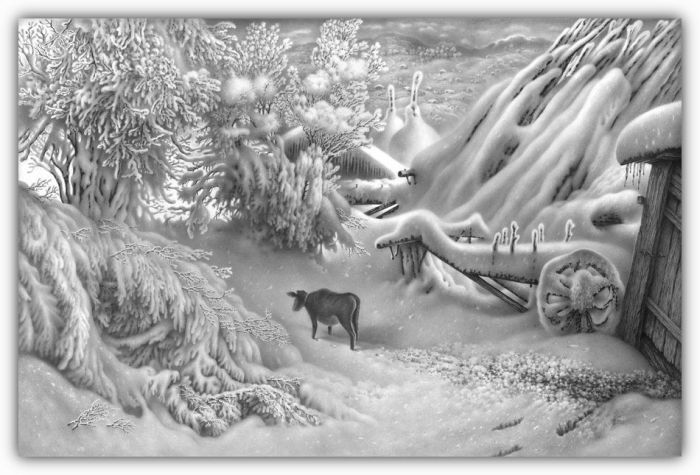 En estas bonitas imágenes podemos disfrutar de la paz y nostalgia de los paisajes naturales en invierno, aunque también nos produzcan esa sensación gélida que tanto repelús nos da en esta época tan fría. Los dibujos son en blanco y negro y están dibujados con una técnica impresionante en detalles.