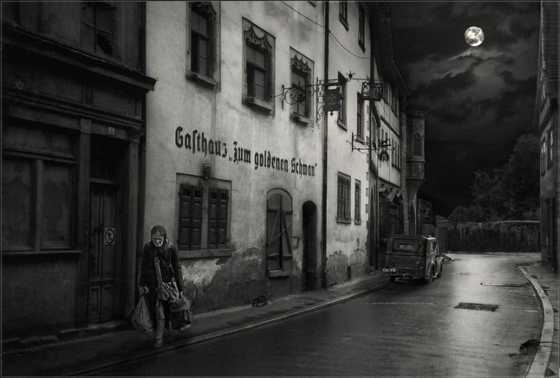 La de la calle esa lúgubre con esa luna llena y encima esas letras góticas de la casa parece que en cualquier momento aparezca el conde Drácula y se cargue a esa pobre señora XD!!!