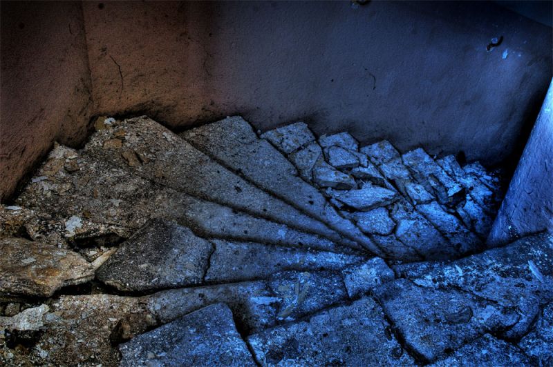 Escaleras lúgubres que llevan a un sótano más lúgubre aun. ¿Qué se tejerá en esas profundidades?