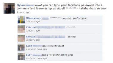 Dylan: ¡Guau! ¡Puedes escribir tu password de Facebook en un comentario, que se convierte en estrellas! ******* ¡Ja. ja, qué chulo!