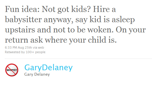 Idea divertida: ¿No tienes hijos? Contrata a una niñera de donde sea, dile que el niño está durmiendo arriba y que no debe ser despertado. Cuando vuelvas, pregunta dónde está el niño.