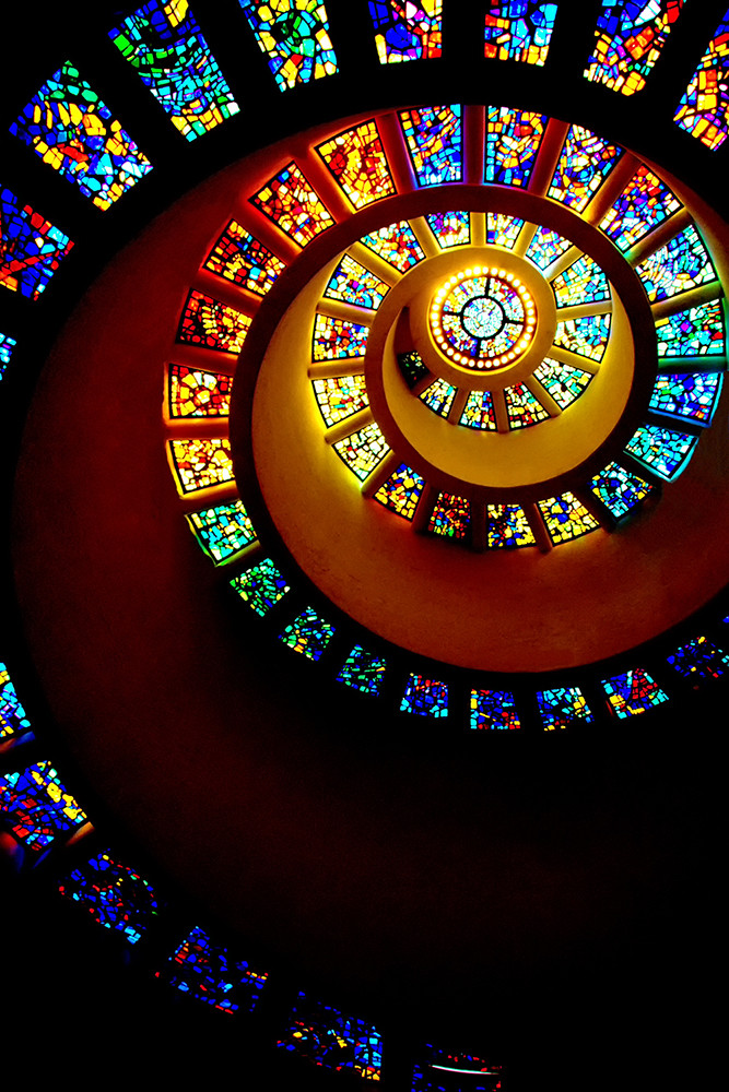 Vidrieras del techo de la capilla en forma de espiral llamada Iglesia del Día de Acción de Gracias, que se puede encontrar en el complejo Thanks-Giving Square de Dallas, Texas.