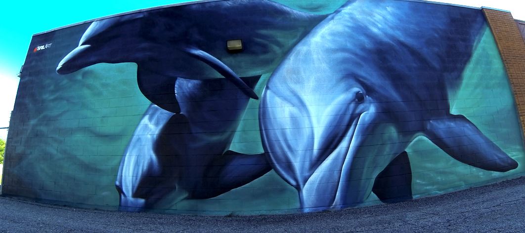 Graffiti de unos delfines pintados con spray en una pared en California, Estados Unidos.