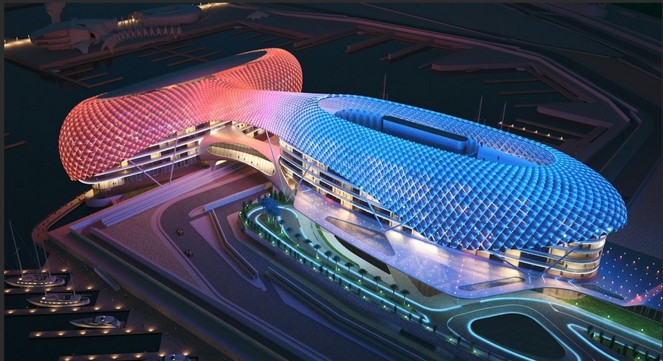 Hotel Yas Viceroy Abu Dhabi, el primero en ser construido en un circuito de Formula 1 (Circuito de F1 Yas Marina en Abu Dhabi, Emiratos Árabes).