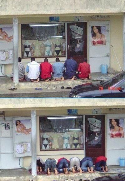 Adoración al wonderbrá. No importa donde estés llegado el momento, hay que rezar puntualmente a Alá.