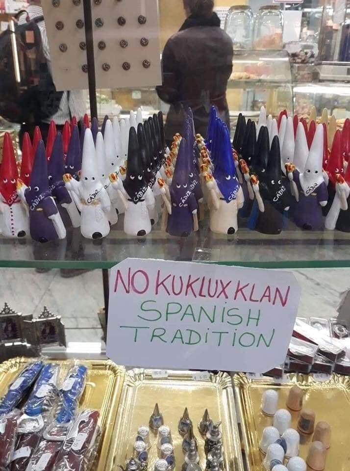 Me parto con esta imagen de un negocio aclarando que sus figuras de los encapuchados de Semana Santa no tienen nada que ver con figuritas del Ku Klux Klan.
