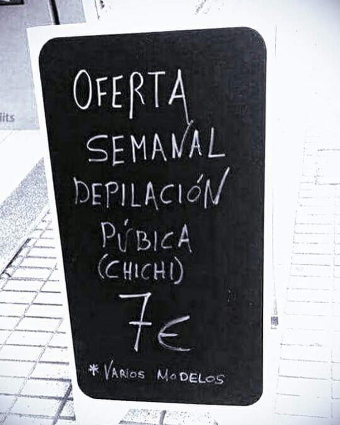 Qué elegancia la de este cartel publicitario de un negocio de depilación que han dejado en la calle para captar clientela. En él reza «OFERTA SEMANAL DEPILACIÓN PÚBICA (CHICHI) 7 EUROS». Creemos que querían ir de refinados, pero cuando terminaron de escribir, lo de la región púbica les resultó muy finolis y lo aclararon con … Leer más