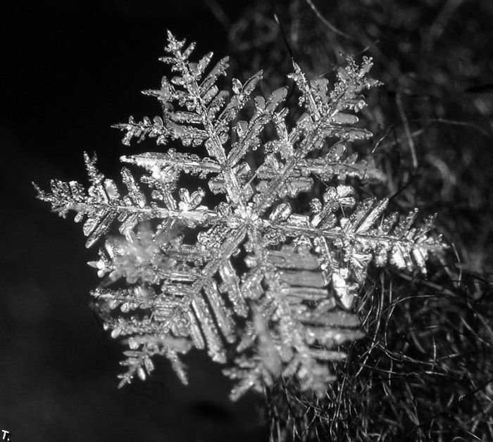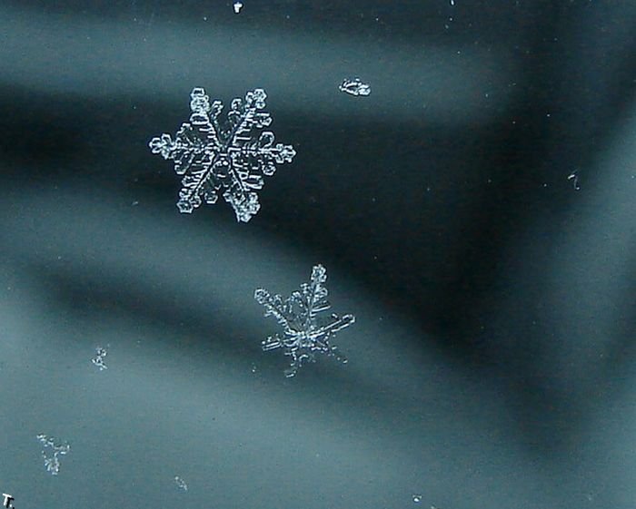 Los copos de nieve son finos, semi-cristalinos y con seis brazos principales en forma de estrella, que se forman cuando las temperaturas oscilan entre -2 ºC y -15 ºC.