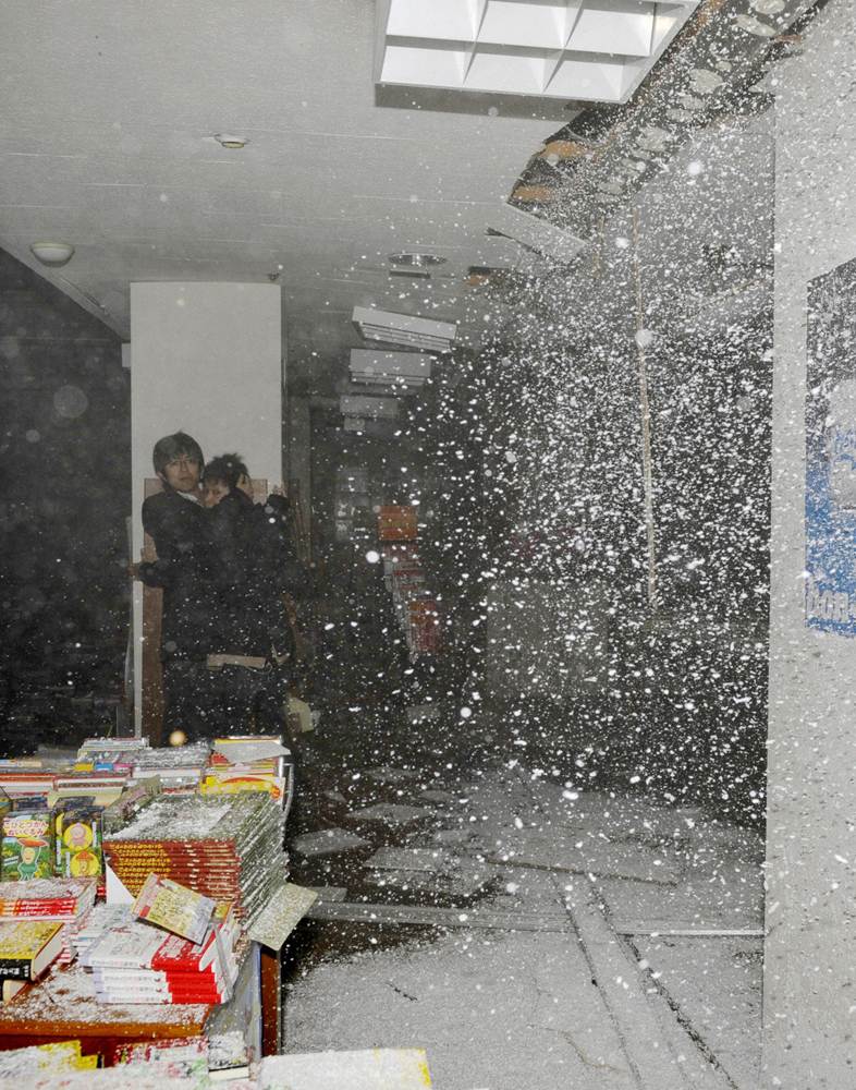 Personas cobijándose mientras el terremoto de magnitud 9 producía daños en una librería de Sendai.