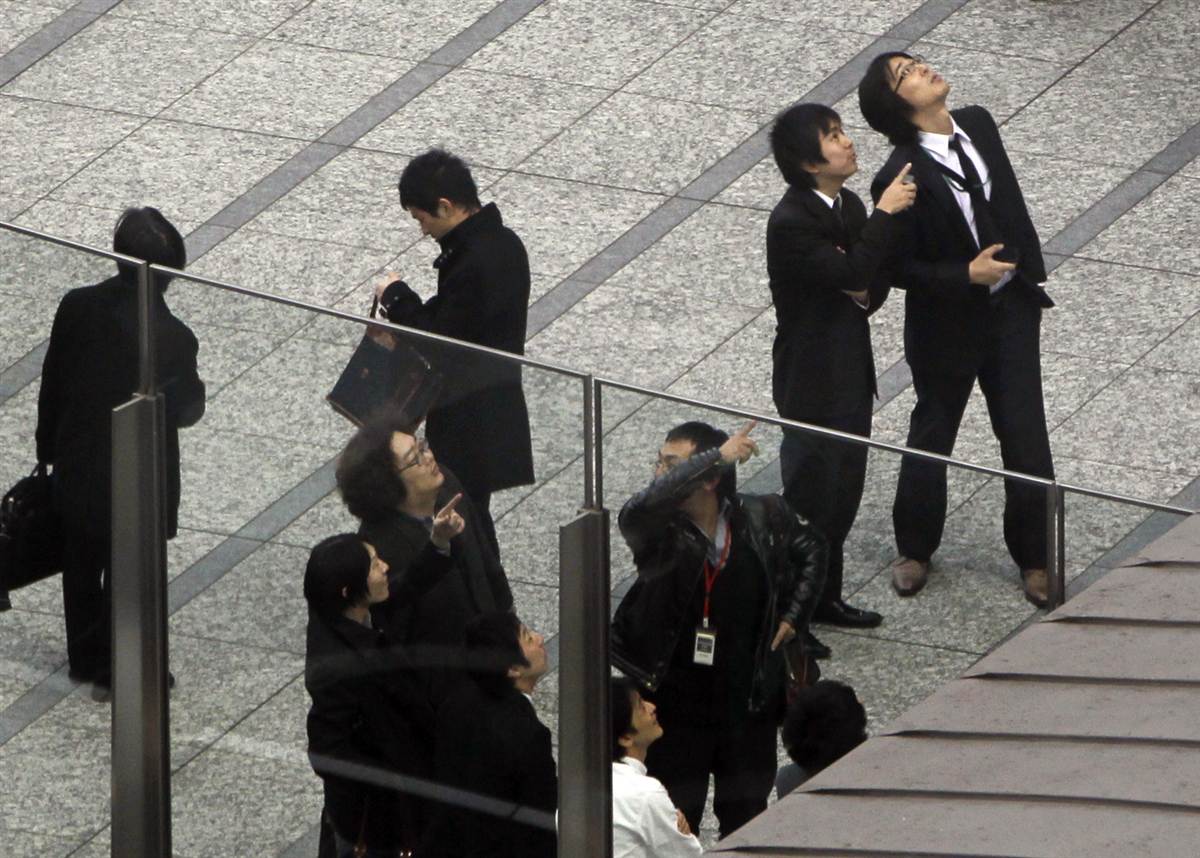 Oficinistas del distrito Shiodome, cerca de la Bahia de Tokio, permanecen en una acera observando cómo se balancean los rascacielos y hoteles tras el terremoto.