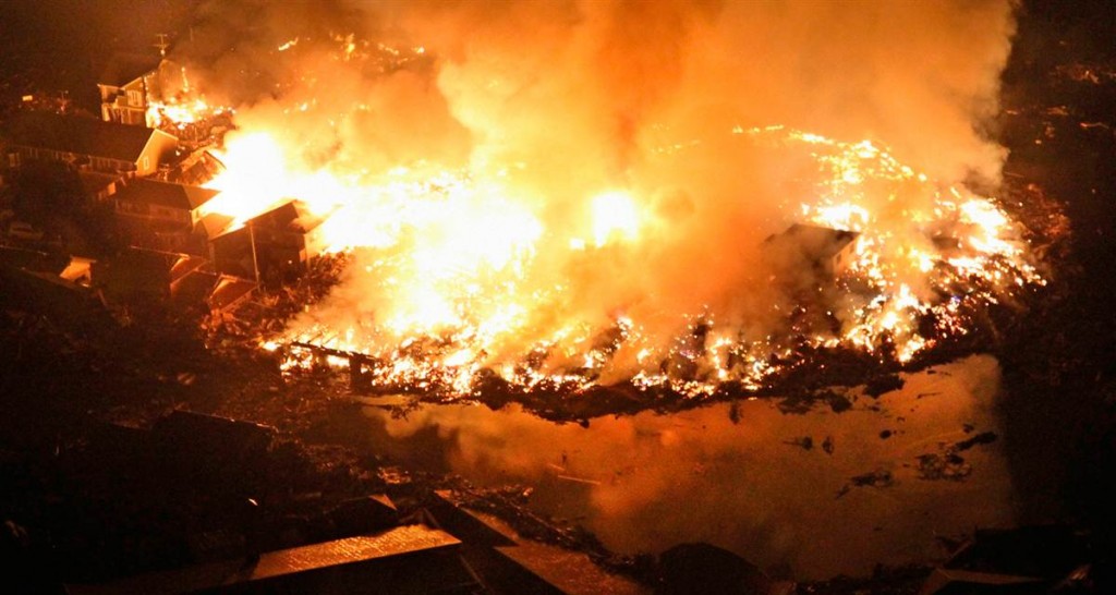 Casas ardiendo tras el terremoto y el tsunami del 11 de marzo en Natori, al noreste de Japón.