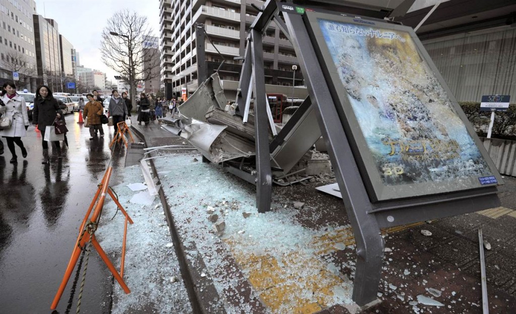 Gente caminando al lado de una parada de autobuses que quedó destrozada por una pared externa de un edificio en Sendai.